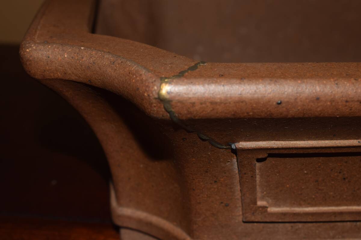サイズ43,0x34,0x11,7cm     人気和鉢作家<小松泉焼・紫泥・手造り・釘彫落款★時代乗り抜群★大き目サイズ・大人気型> 外縁大隅切額入長方鉢のご紹介です・・大人気の希少型・大人気作家・泥味抜群、丁寧な造り・・ 紫泥の泥味が良く、実用にも優れた素晴らしい逸品です・画像で分かる様に金繕いが御座います。その他目立つ傷はありません。・・・ 大変古い物ですので縁・足等にホツ・スジ・カケ等がある場合がございます。 状態を良くご確認の上、ご入札宜しくお願い致します。。画像を良くご確認の上、御入札宜しくお願い致します。完品をお求めの方は入札をお控えお願い致します。*注意事項* オークション終了後48時間以内に必ずご連絡をお願いします。ご連絡がない時は、ご購入意思がないと判断し、落札者さま都合のキャンセルとさせて頂きます。再三のご連絡を差し上げても、ご連絡がない場合は、時点繰り上げとさせて頂きます。マイナス評価の多い方や新規の方を削除する場合がありますので、ご了承下さい。また、入札価格が低価格の場合は取消終了とさせて頂く場合がございますので、ご了承願います。古い物等ございますので小さな傷等は、見落とす場合がございますので、写真を良くご覧になり納得の上ご入札して下さい。また、完品をお求めの方は入札をお控えお願い致します。キズ・破損等のご連絡は商品到着5日以内にご連絡ください。それ以降は対応致しかねますので到着後、商品を必ずご確認ください。輸送中の事故(鉢が割れる、枝が折れる等)