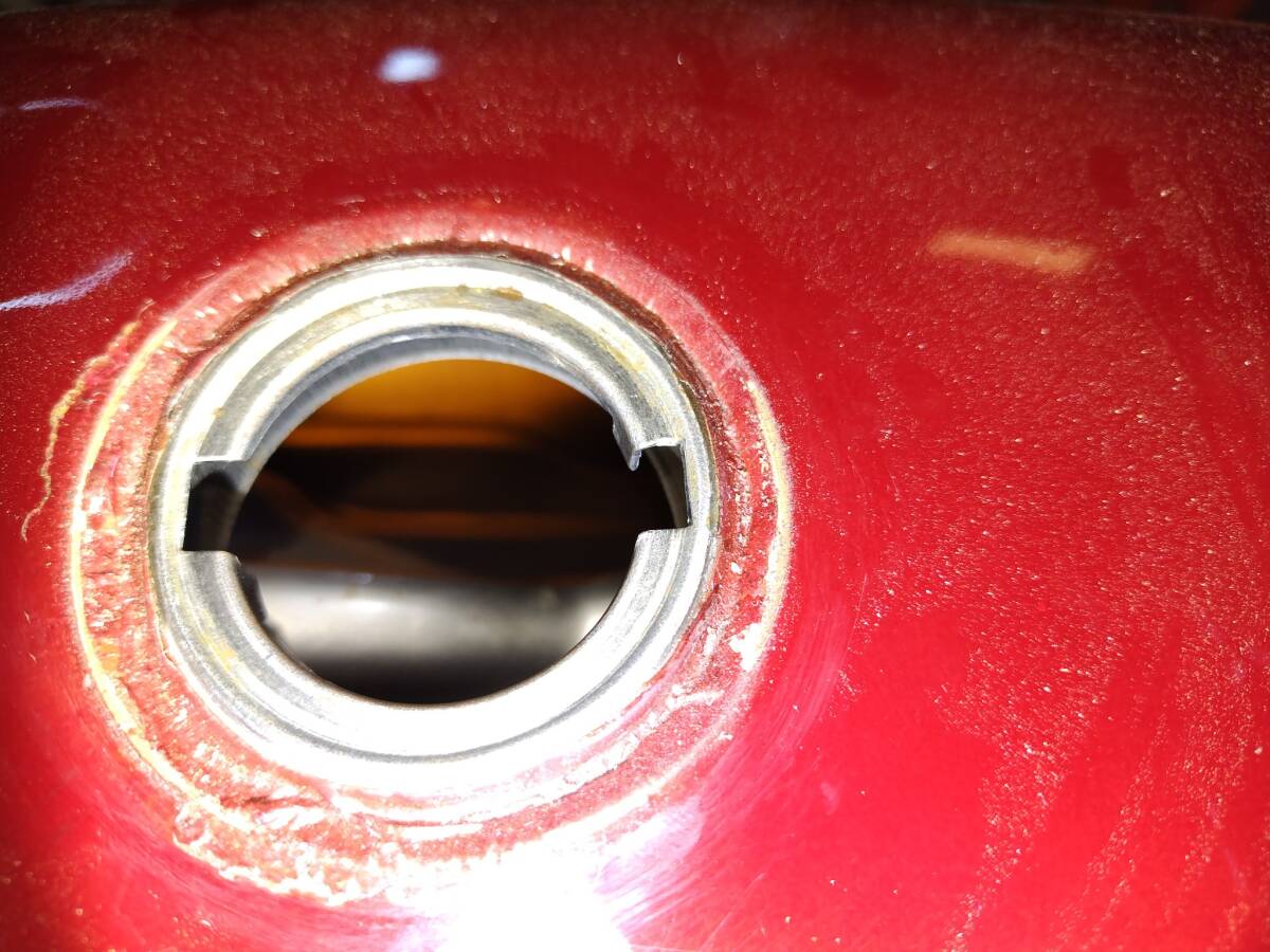 燃料タンク:給油口のカバーみたいのが外され、スムージングされ、赤っぽいブラウンに塗装されています。ステッカーもオリジナルではないです。