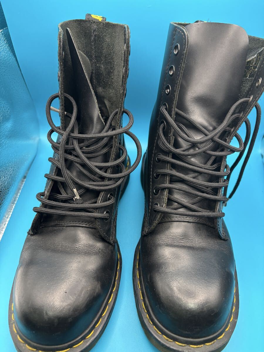 ブラックレザーのハイカットワークブーツ、ラバーソールで耐久性抜群。