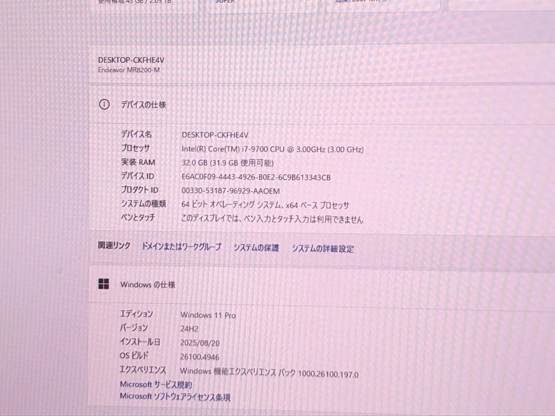 Product name: 【EPSON】Endeavor MR8200-M Core i7-9700 メモリ32GB SSD256GB NVMe+HDD2TB GeForce RTX 2070 SUPER Windows11Pro 中古デスクトップPC
