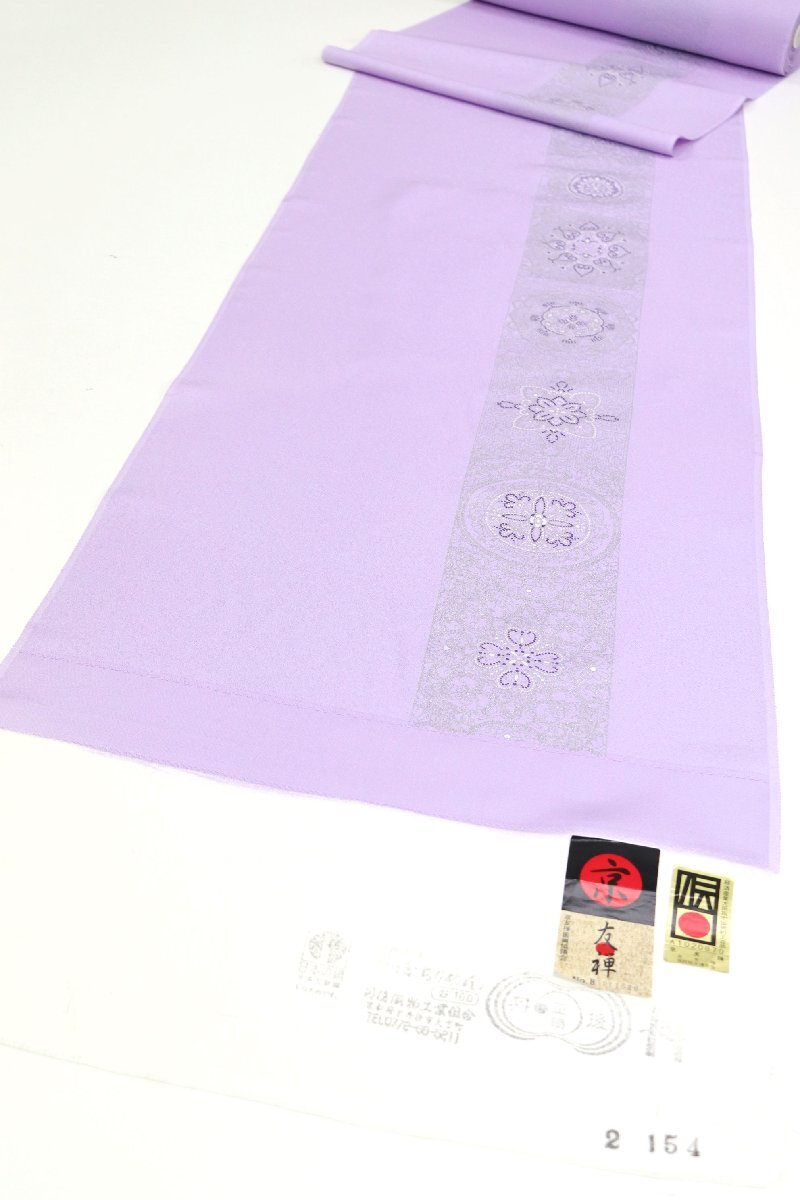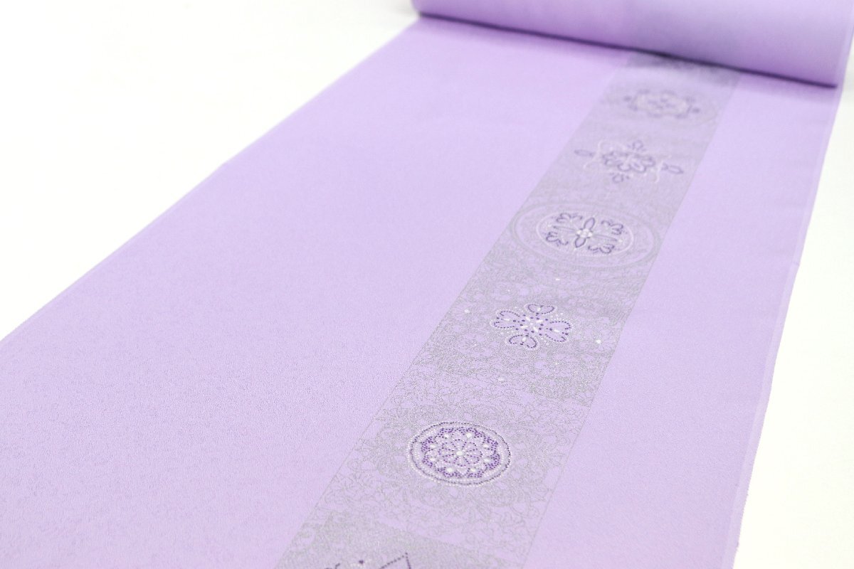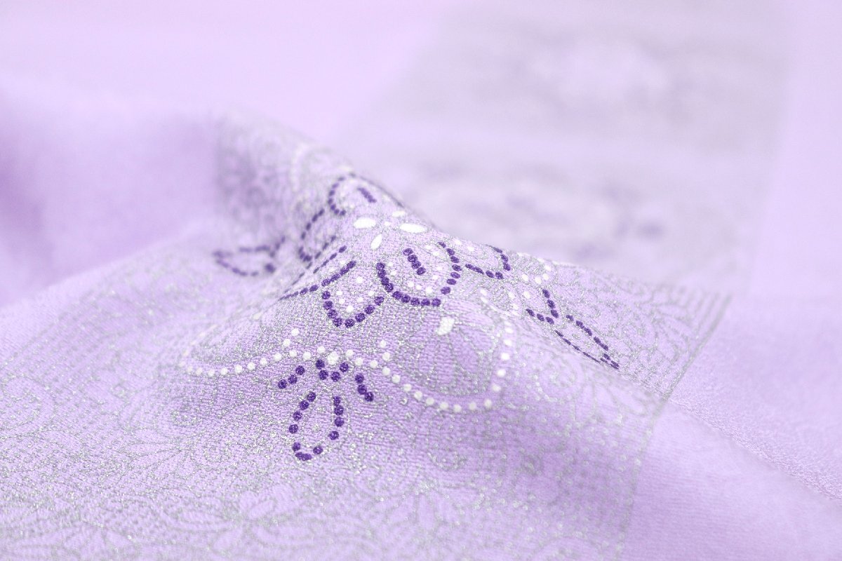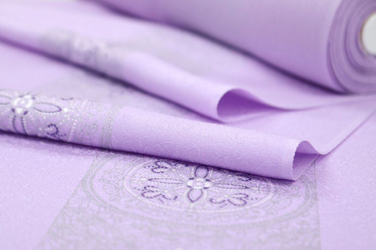 しっとりとした上質な丹後ちりめんの生地は、薄紫色お色目でございます。生地には唐花の地紋が織り込まれており、やや光沢感がございます。