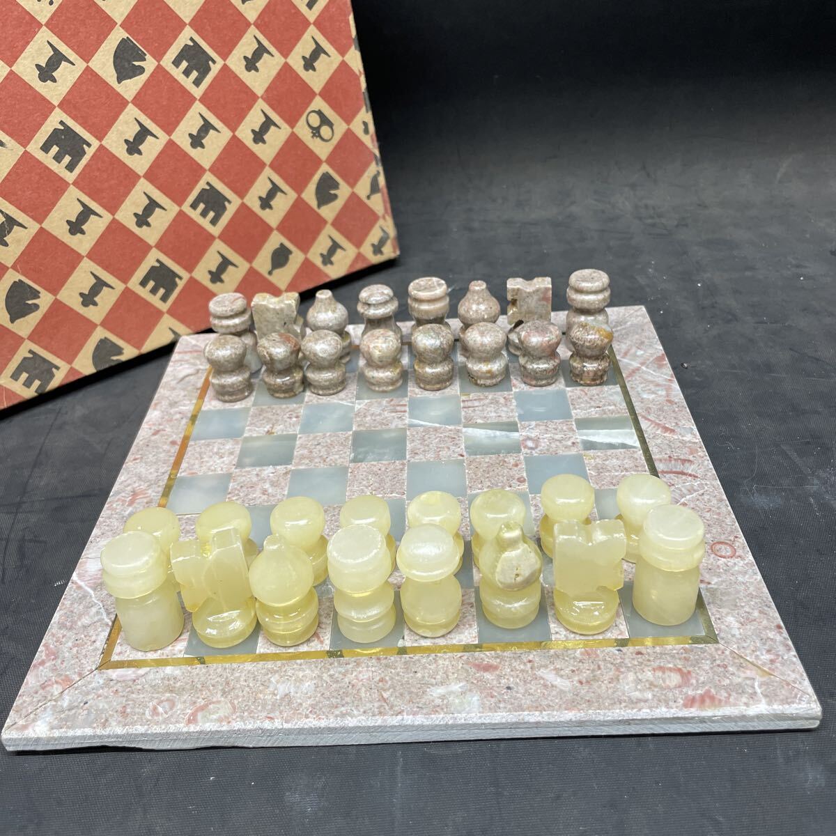 G3374 【天然石 チェスセット】 レトロ ヴィンテージ チェスゲーム チェスボード インテリア 箱あり 中古 長期保管品 現状品