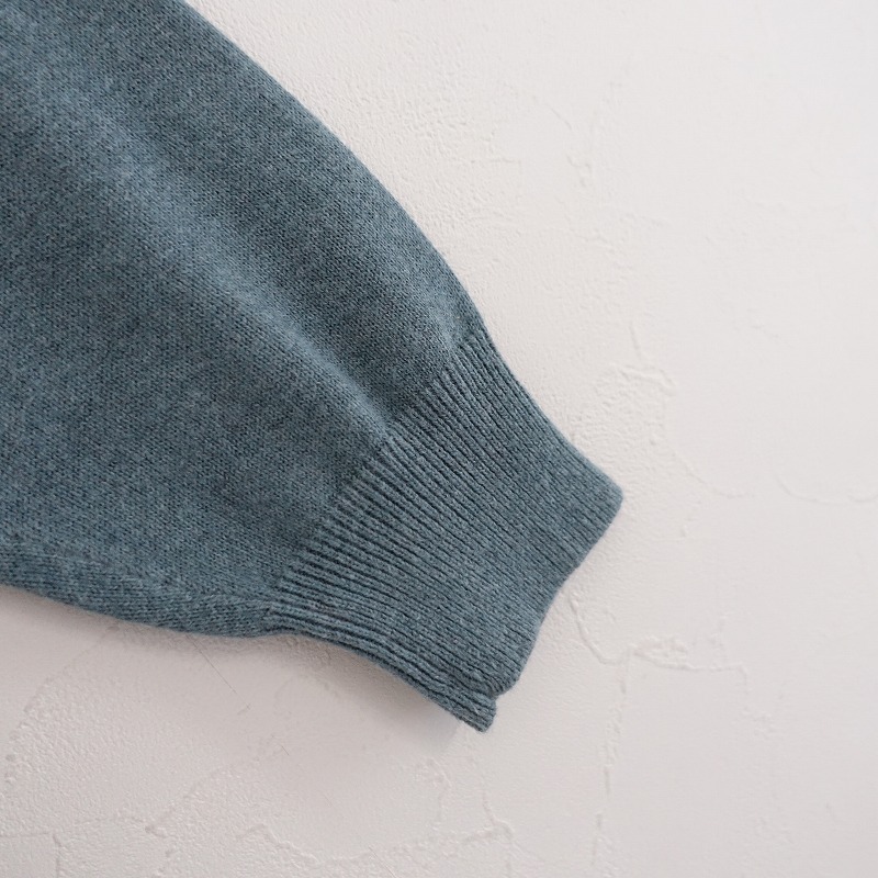 Sally Scottのコットン混ニットプルオーバーです。カラーはグレーブルー・ホワイトで、やや起毛がかった薄手ニット素材です。袖口&裾はリブ仕様で、サーモンピンクのフレンチノット刺しゅうがあしらわれております。