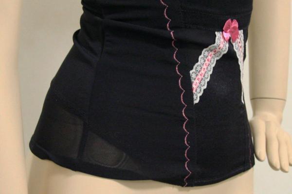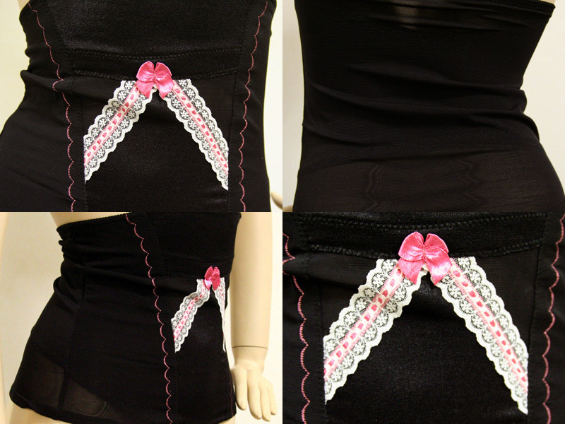 ・生地はフロント部分には、光沢のあるサテン地を用い、おなか押さえ効果を発揮して、その他の部分は伸縮性に優れたメッシュ生地を用いることによりむれを防ぎ、機能性とデザインの両面どちらも納得いただける仕上がりです。