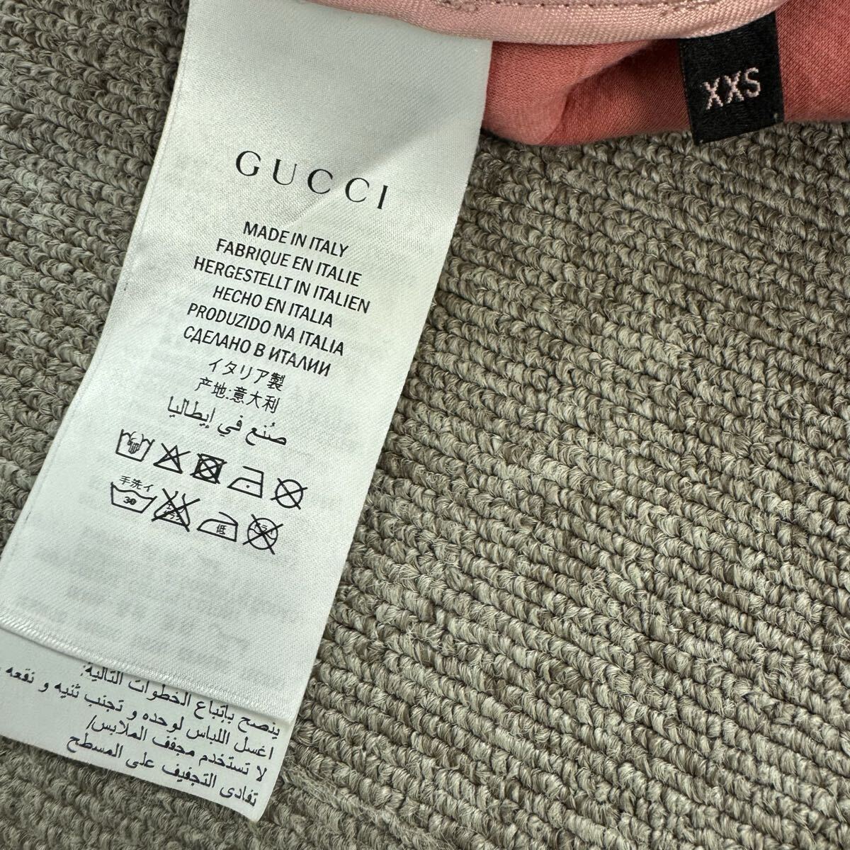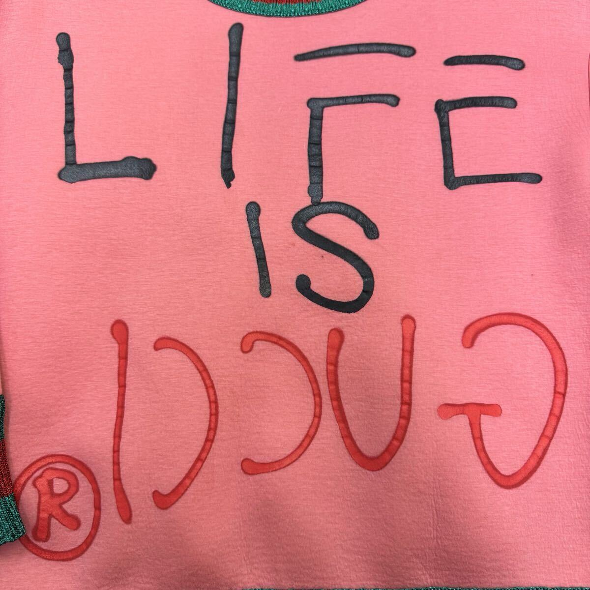 15『極美品・現行タグ』 GUCCI グッチ レディース ニット スウェット LIFE IS GUCCI ボンディング加工 ピンク Sサイズ相当