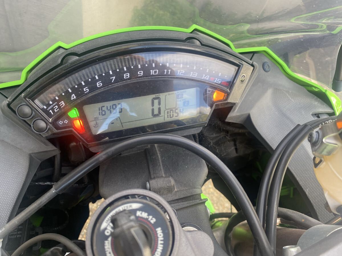 走行16500km 4年前に近くのバイクショップで11000km走行の中古車を購入しました。立ちごけがあったようで右のグリップエンド、タンデムステップ、フレームに傷があります。タンクには少し大きめのエクボがあったのでパテ盛りし、上からカーボンのタンクカバーをつけてますが、中古のカバーなのでこれはこれでカーボン立ちごけ跡のようなものがあり、表面も劣化てくすんでいます。サイレンサーにも傷ありましたが、程度のよい中古品に交換しました。
