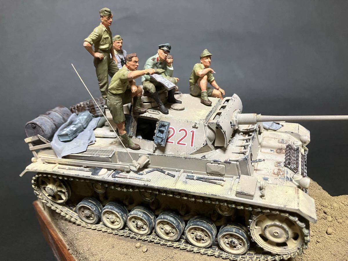 タミヤⅢ号L型と、マスターボックスのロンメル将軍とタンククルーの組み合わせを製作、塗装、ウェザリングしベースにセットしました。