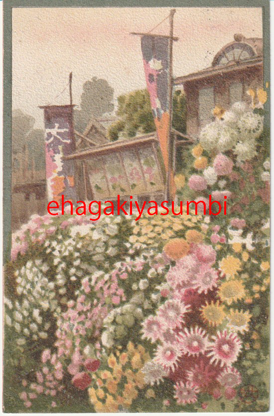 戦前絵葉書■アート イラスト■丸山晩霞画 劇場と花図  明治実逓
