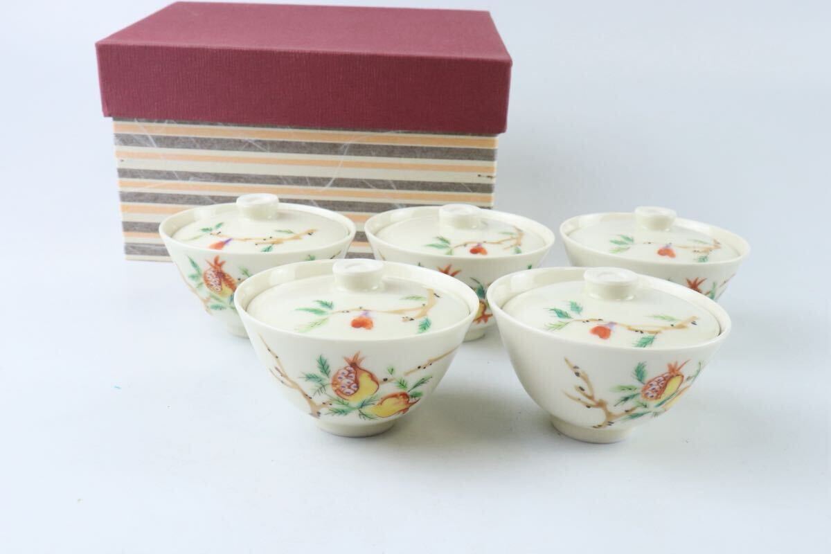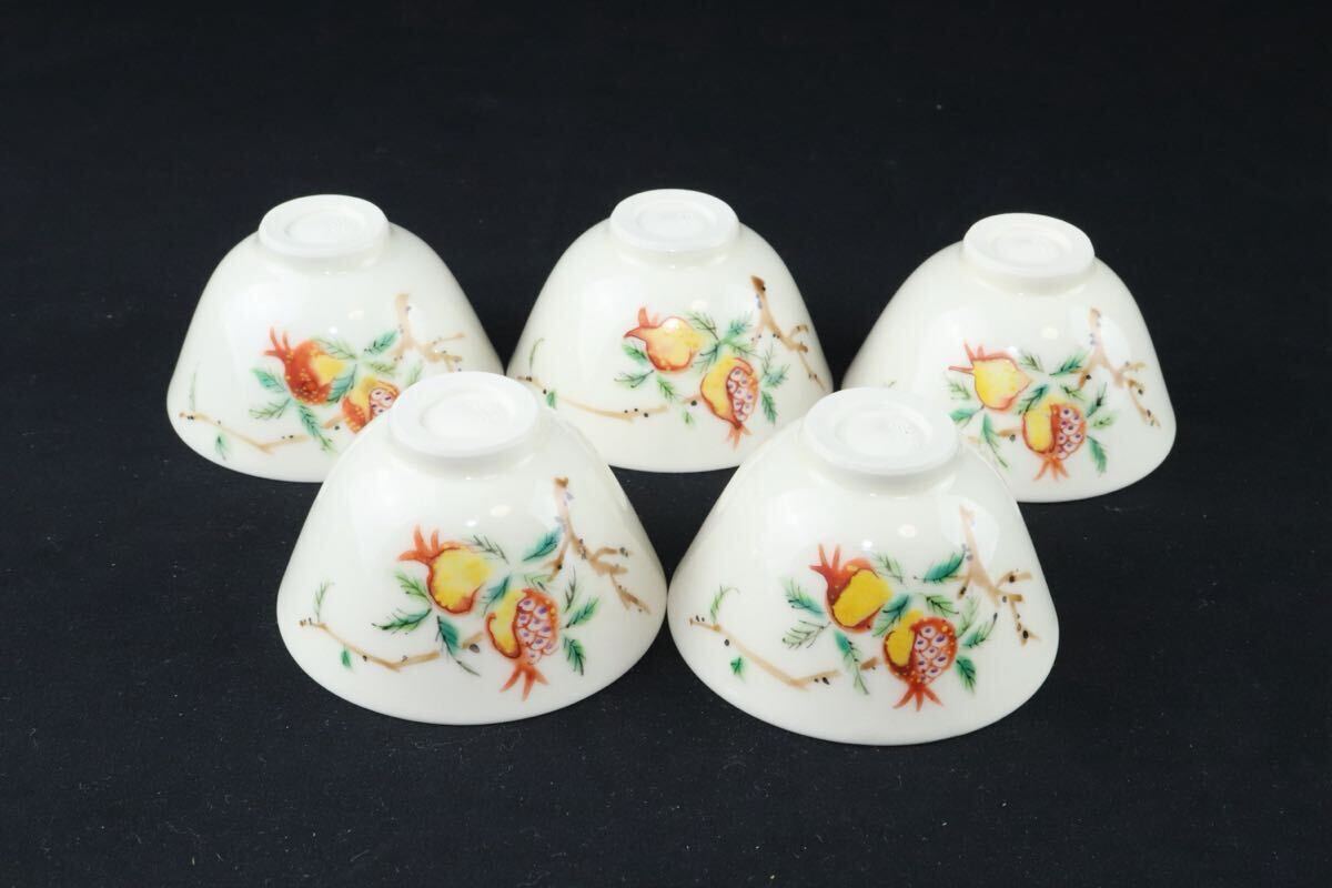 Product name: 【葉】043 煎茶道具 京焼 村田亀水 色絵 柘榴文 啜茶碗 煎茶碗 蓋茶碗 五客 在銘 共箱 保証品