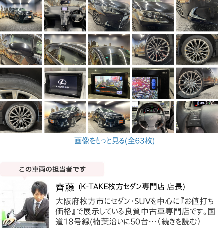 K-TAKE枚方店は国産セダン・SUV・ステーションワゴンを中心に取り扱いしております。趣向性の高い車種になりますので、専門知識を持ったスタッフにてご案内させて頂きます。コーティングやカスタム等はもちろん、任意保険、オートローンまで安心のカーライフをお約束致します。整備、保証などのアフターサービスも当店ですべて行えますのでご安心ください。当社は全国のオークション会場、約160カ所と業務提携を結んでおります。全国60000台以上の中古車を当店でご商談、ご契約、ご納車可能です!