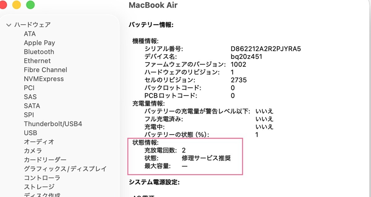 ・ 状態 : 修理サービス推奨 バッテリー不良と思ってください