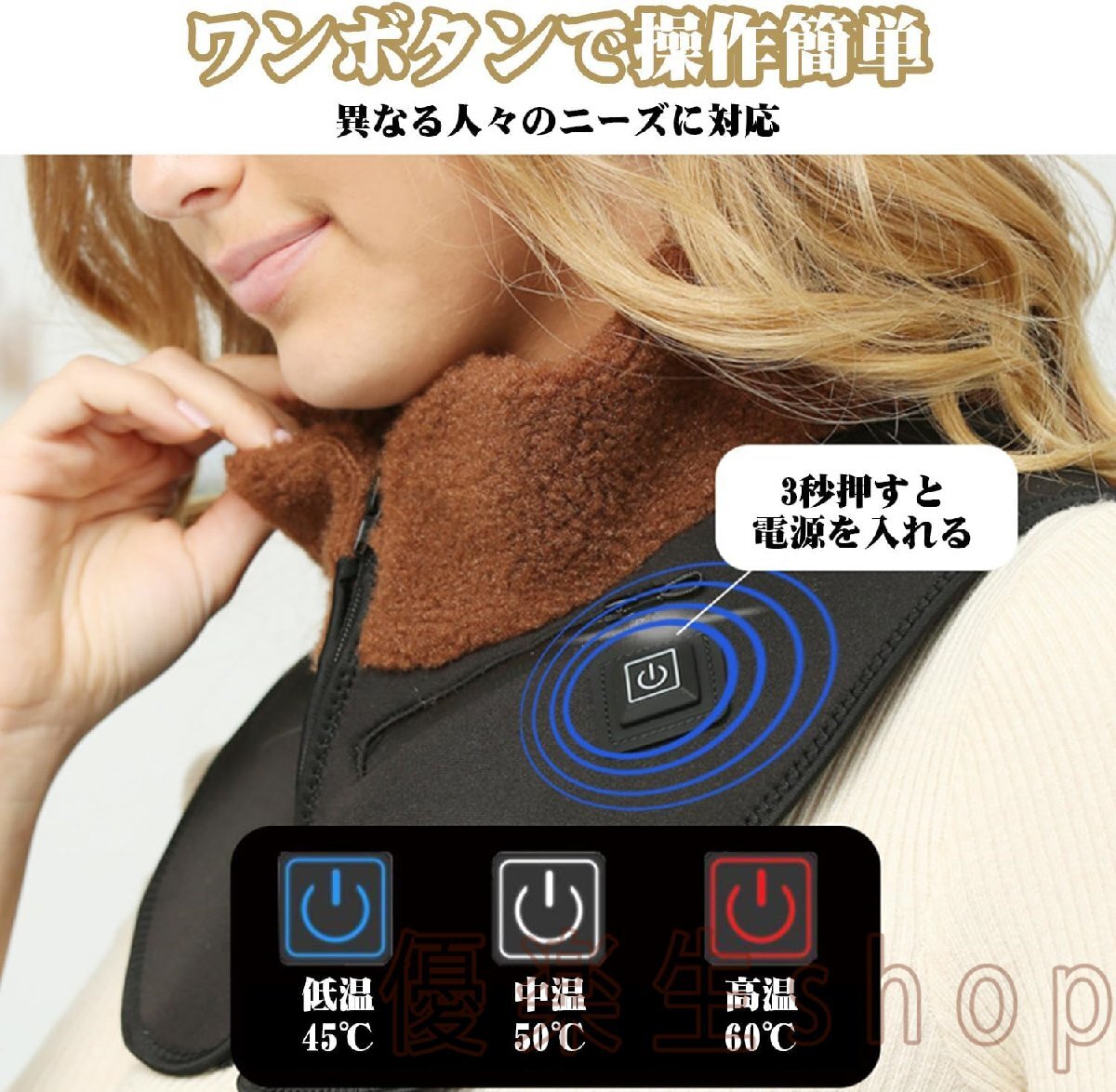 3階段の温度調整:電気肩パッドは3段階(45℃、50℃、60℃)の温度を調節可能で、適切な温度設定より体を暖めます。思いやりのある温度設計により、過熱や過冷却の心配がなく、両肩と背中を暖かくなります