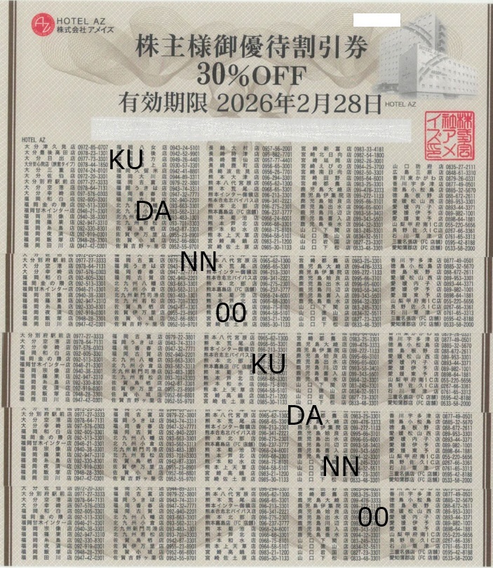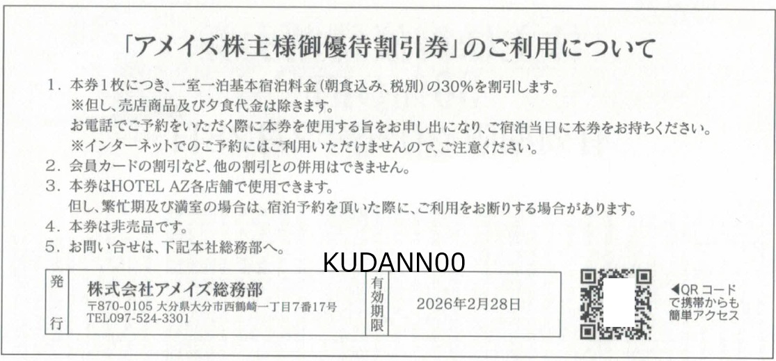 Product name: 【送料込み】アメイズ 株主優待 30%OFF 優待割引券5枚セット・AZ ホテル AZ HOTEL 有効期限:2026年2月28日