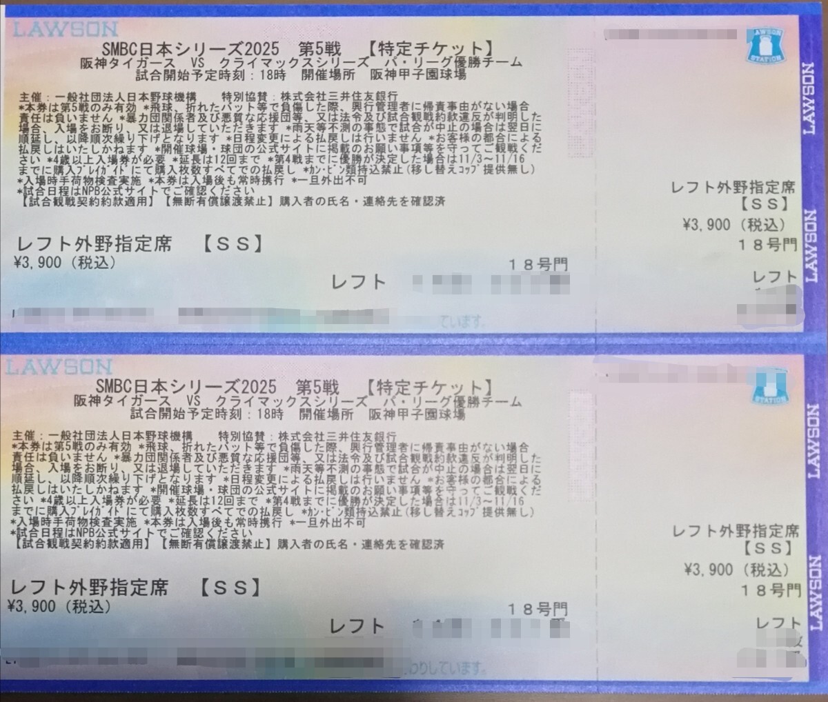 Product name: 第5戦 レフト指定席下段 2枚 連番 阪神甲子園球場 SMBC日本シリーズ 阪神タイガースvsソフトバンクホークス 90%中止補償 簡易書留