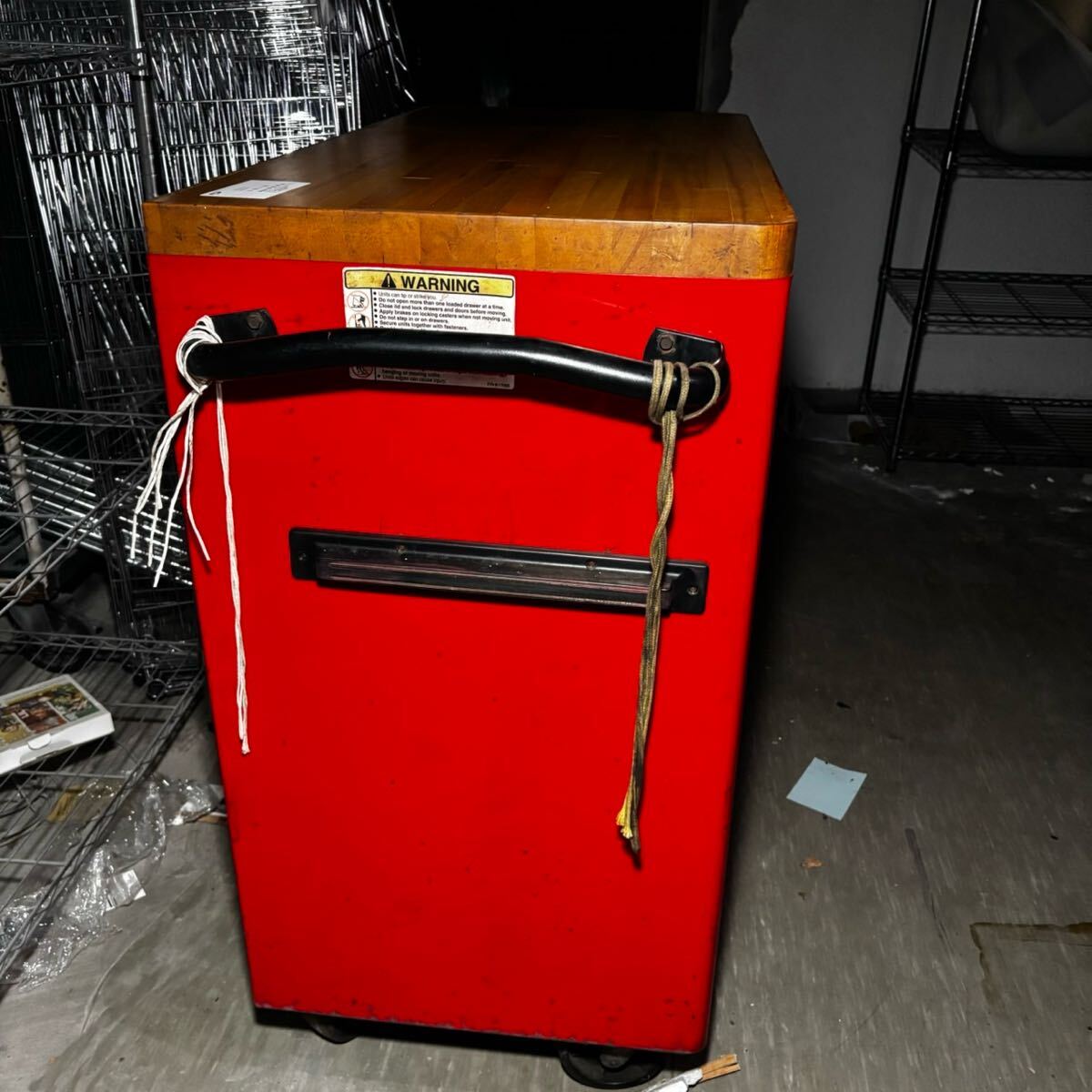 多くの引き出しを持つ多段式のツールボックスで、工具や部品を整理して収納できます。