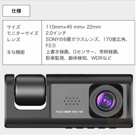 本体は2.0インチ液晶IPSモニターで、コンパクトなので、見やすいの同時に運転の視野の邪魔になりません。前中後3カメラで同時高画質録画、140°幅広い角度で撮影でき、死角を最大限減らします。