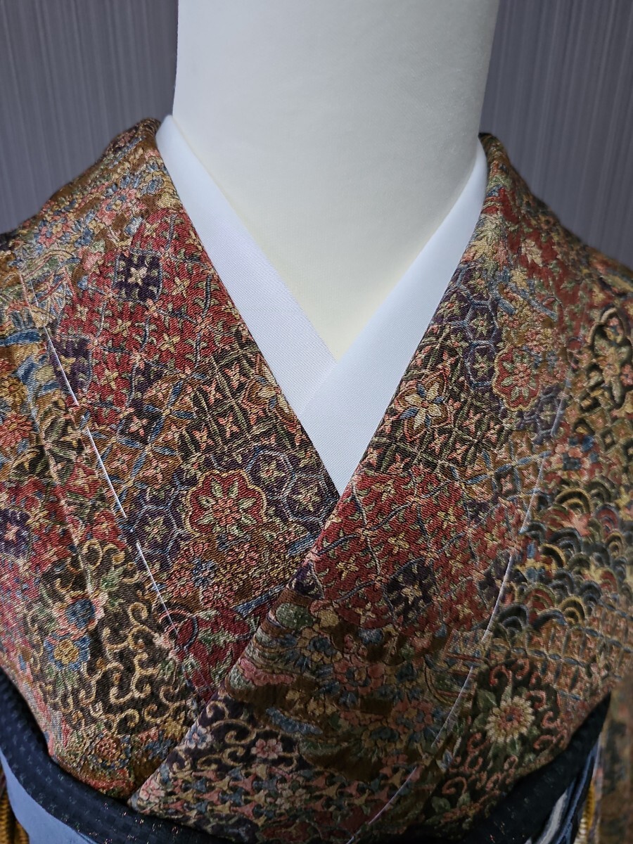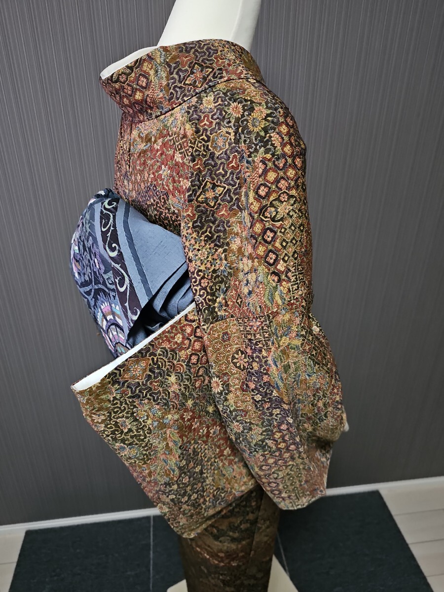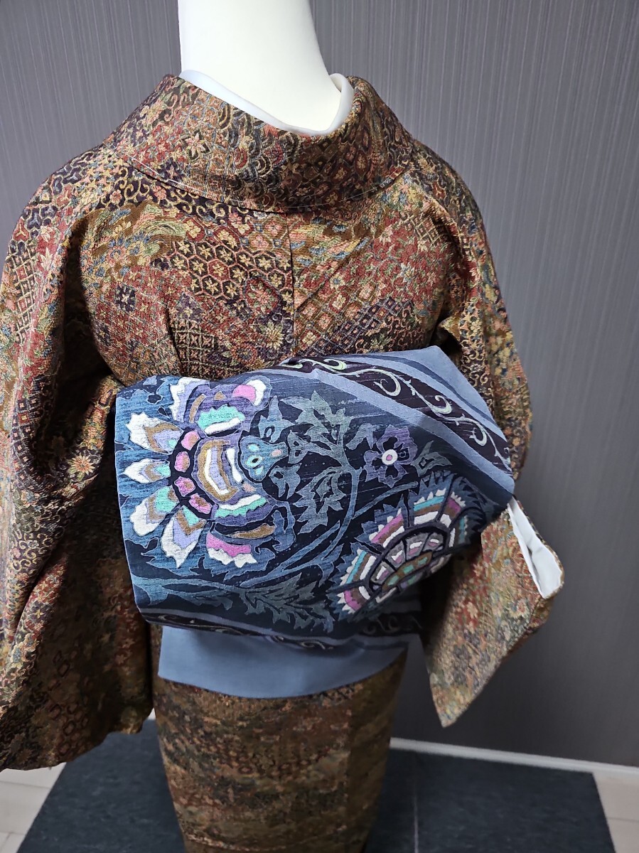 ★しっかりとした質感の上質浜縮緬生地、茶系、江戸更紗染の更甚によるオリエンタルな雰囲気と日本的情緒美溢れる上等なお召し物でございます。