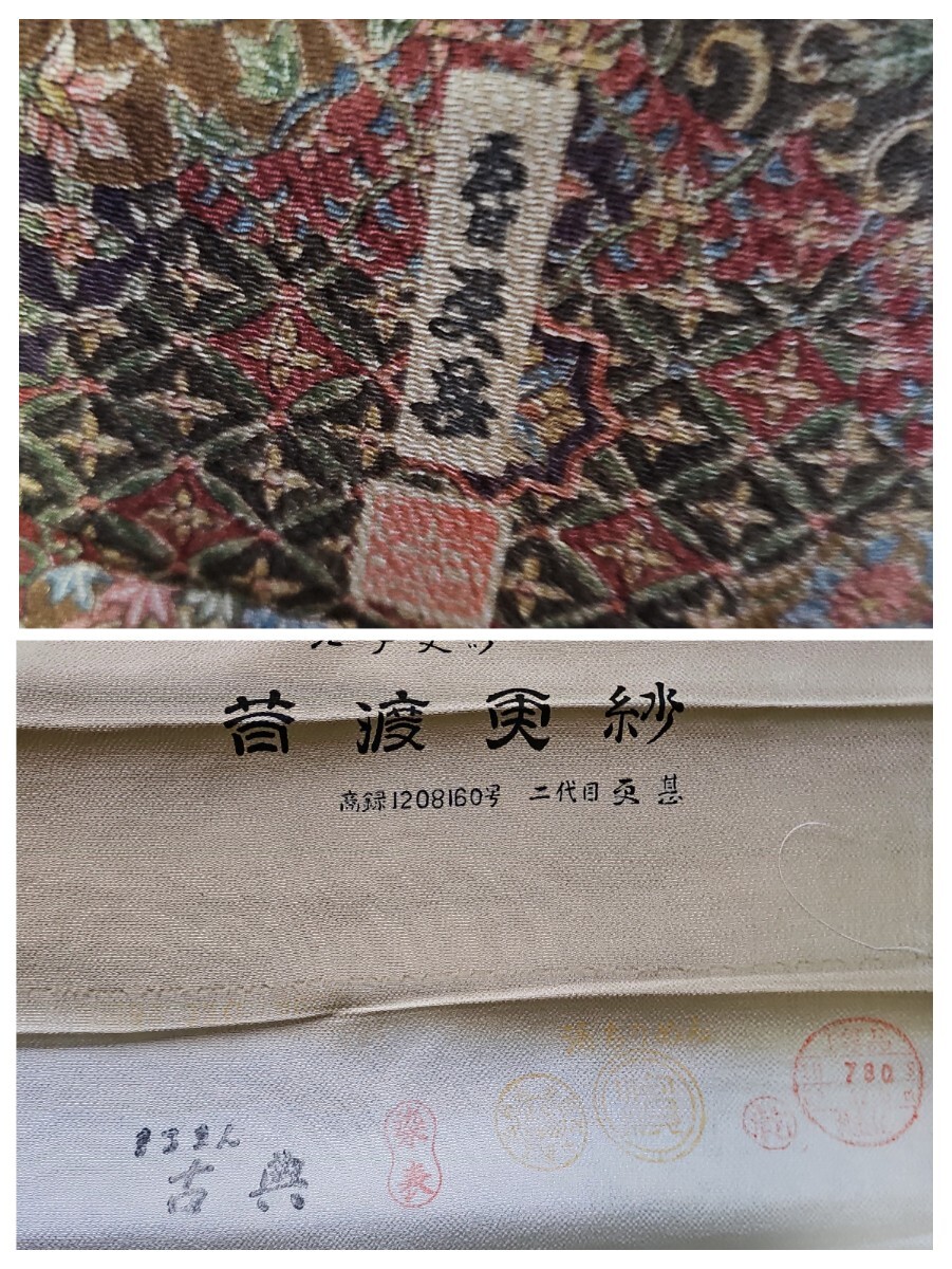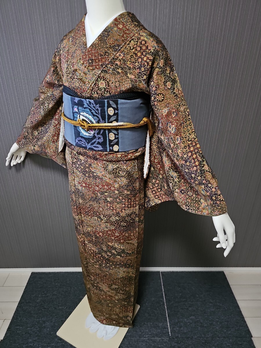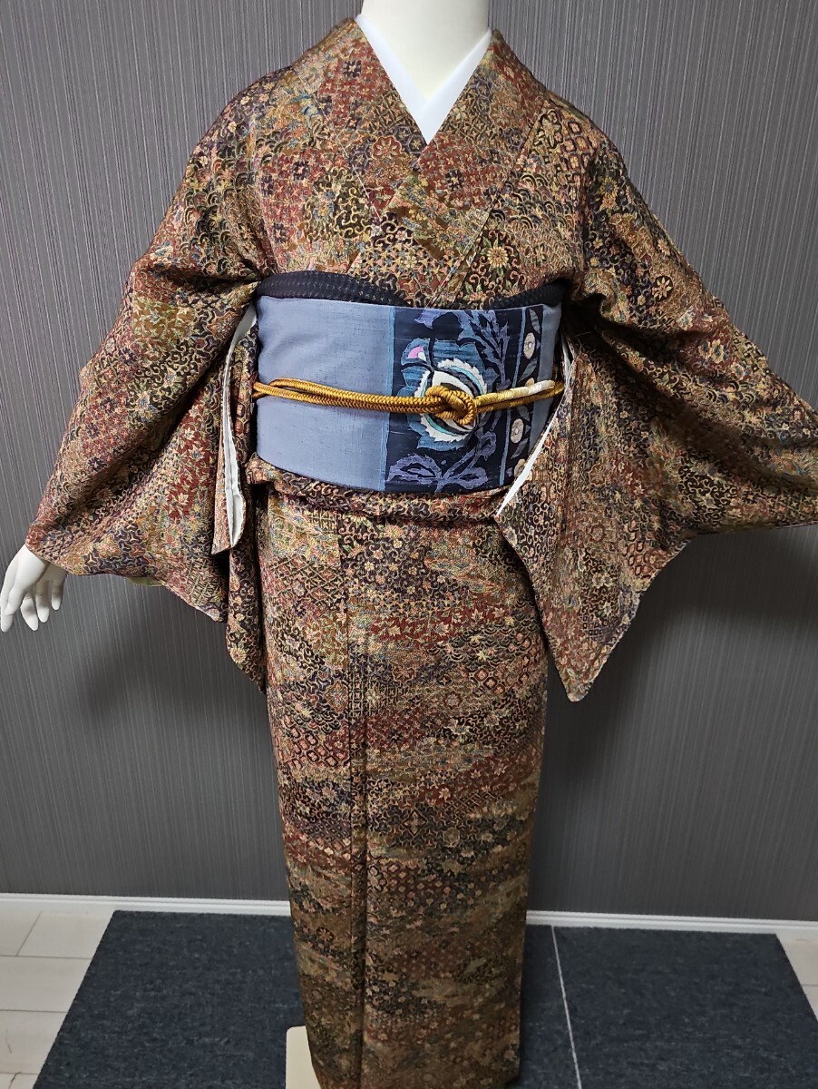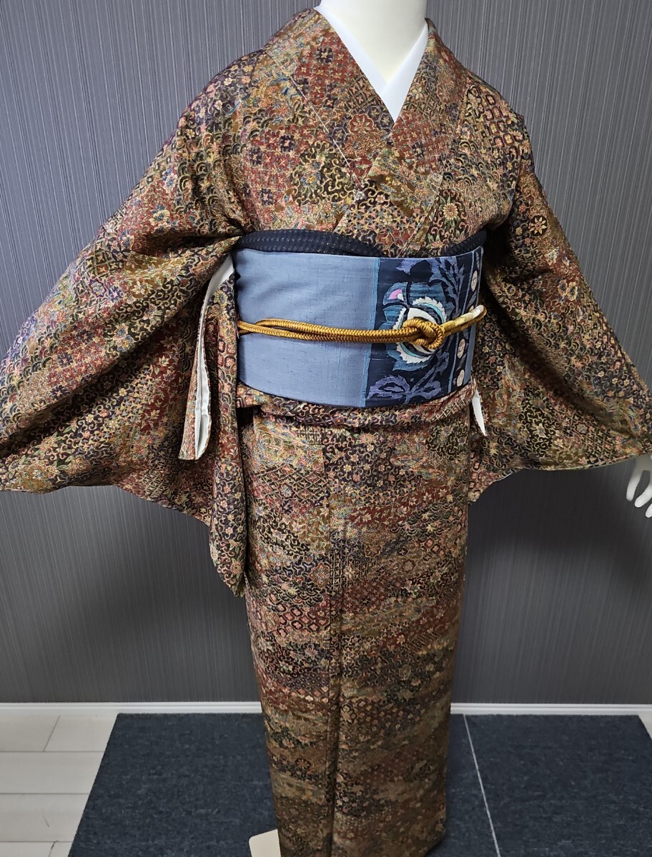 Product name: すずや■258【袷】正絹【江戸更紗 更甚】浜ちりめん小紋 裄丈68cm  着丈161cm  茶系