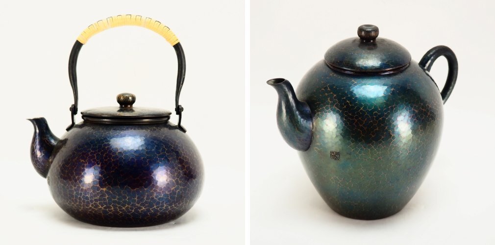 玉川堂造。見事な鎚起銅製鎚目紋茶器揃九点です。共箱付き。本物保証品。