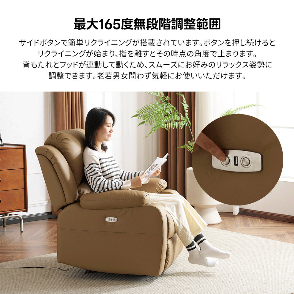 ◆01電動リクライニングソファ たっぷり詰め込まれたふわふわの綿で快適な座り心地。 思わず“沈み込む”ような、極上のリラックス空間。 高さ調整が可能な便利なテーブル付き。 ソファ耐荷重:130kg ◆02 64~74cmの間で高さ調整が可能なテーブル テーブル耐荷重:3kg 高さ調整が可能なテーブルは、差し込むだけで簡単にセットします。64~74cmの間でお好みの高さに調節し、使わない時は取り外してすっきり収納できる便利な設計です。 テーブルは回転式で、用途に合わせて自由に調整可能。仕事や読書、テレビ鑑賞など、シーンに応じて快適にお使いいただけます。 ご注意 1.本を読んだりテレビを見たり、パソコンを使ったりする際は、重すぎる物は避けてください。重い物を置くと、板が曲がる恐れがあります。 2.片側のみ調整可能です。最大角度に調整する際は、テーブルの傾斜にご注意してください。 3.テーブルを使う前に、しっかり固定されているか確認してください。安定しない状態で物を置かないようにご注意してください。 ◆03最大165度無段階調整範囲 サイドボタンで簡単リクライニングが搭載されています。ボタンを押し続けるとリクライニングが始まり、指を離すとその時点の角度で止まります。背もたれとフッドが連動して動くため、スムーズにお好みのリラックス姿勢に調整できます。老若男女問わず気軽にお使いいただけます。 調整の際には、ソファの長さが変わる点にご注意ください。調整前の全長は約76cmですが、リクライニングを最大にすると約162cmまで伸びます。ソファと壁の間には少なくとも41cmの距離を保つことをお勧めします。設置スペースを確保し、周囲の家具や壁との距離を考慮してご利用いただくようお願いいたします。 ※角度を調整する際には、 周りに小さな子供やパットがいないことに気を付けてください。誤って彼らに怪我をさせてしまうことがないようにするためです。 ◆04座る、寝る、楽しくになる 座面 体にフィットするよう設計された座面は、自然に下へ沈み込む構造で、快適さと人体工学に基づいたサポートを両立します。 背もたれ 背もたれはまるでふっくらとしたパンのような形状で、柔らかく体を包み込みます。 フットレスト フットレストをしっかり支えることで、全身がリラックスできる構造です。 このような座り心地の良さを実現しているのは、使用している素材がしっかりしているからです。 PP綿がしっかりとした支えを提供し、コットンが柔らかな座り心地を実現。2つの素材を絶妙に組み合わせることで、快適さとサポート力を両立させた理想的な座り心地を生み出します。 座面の通気性を高める優れたSパネルパンチングと高い弾力性が特徴のコイルばねを含まれて、しっかりと体を支えつつ、弾力のある快適な座り心地を実現します。 ◆05包み込まれる柔らかく心地 体の部位ごとに最適な曲線と柔性を設計し、全方位て 身体によりフイットする圧カ分散を実現します。 座っても、寝転んでも、頭から足先まで至高の快適です。 ◆06USB充電口搭載 USB充電口搭載で、スマートフォンの充電がソファに座ったまま手軽に行えます。くつろぎながら、いつでも快適にデバイスを使用できます。 ※電動ソファの充電ポートは出力が低いため、ノートパソコンの充電には対応していません。タブレットの充電が対応できない場合もあります。 ◆07便利なサイドポケット 便利なサイドポケットが付いています。ソファの側面に配置されており、リモコンやスマートフォン、本や雑誌などの小物を収納するのにぴったりです。 ◆08電源収納スペース コードを使わないときは、裏のカバーをめ<れば中に収納ができます。 マジックテープ式ですのでめくれる心配もありません。 ご注意 ケーブルがフレームむに圧迫されて折れる可能性がごさいますので、 白い結束パンドを外しないでください。そのままご使用いただけますようお願い申し上げます。