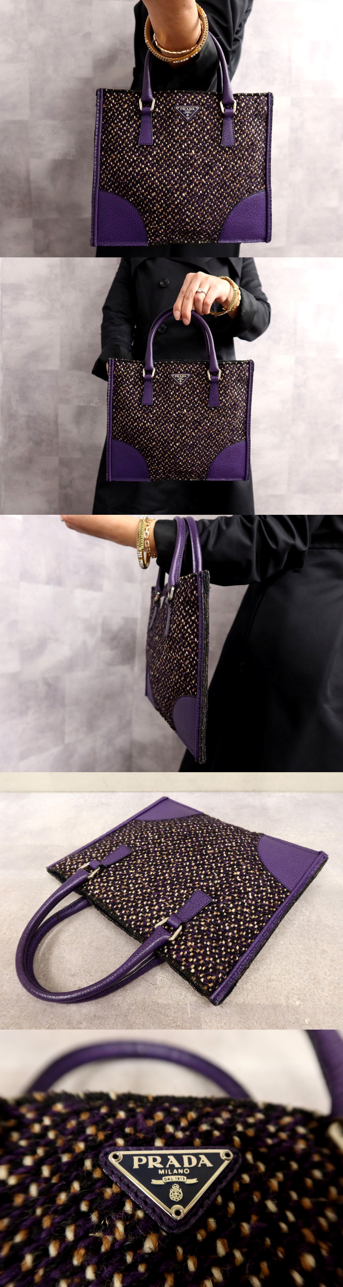 Store ●超美品●PRADA プラダ●三角ロゴプレート●ツイード カーフ レザー 本革●ハンド バッグ●パープル●シルバー金具●イタリア製●Js65217