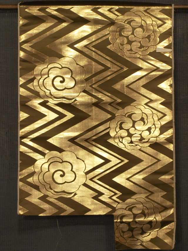 詳細  璃寛茶(りかんちゃ)色の地に、山路と立波丸、雲丸の文様が織り込まれた、本金箔の西陣織の錦織の帯地のはぎれです。丸帯の残布と思われます。下端から長さ約 17cm ほど欠けています。