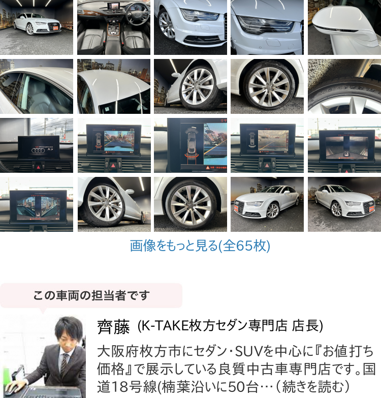 K-TAKE枚方店は国産セダン・SUV・ステーションワゴンを中心に取り扱いしております。趣向性の高い車種になりますので、専門知識を持ったスタッフにてご案内させて頂きます。コーティングやカスタム等はもちろん、任意保険、オートローンまで安心のカーライフをお約束致します。整備、保証などのアフターサービスも当店ですべて行えますのでご安心ください。当社は全国のオークション会場、約160カ所と業務提携を結んでおります。全国60000台以上の中古車を当店でご商談、ご契約、ご納車可能です!