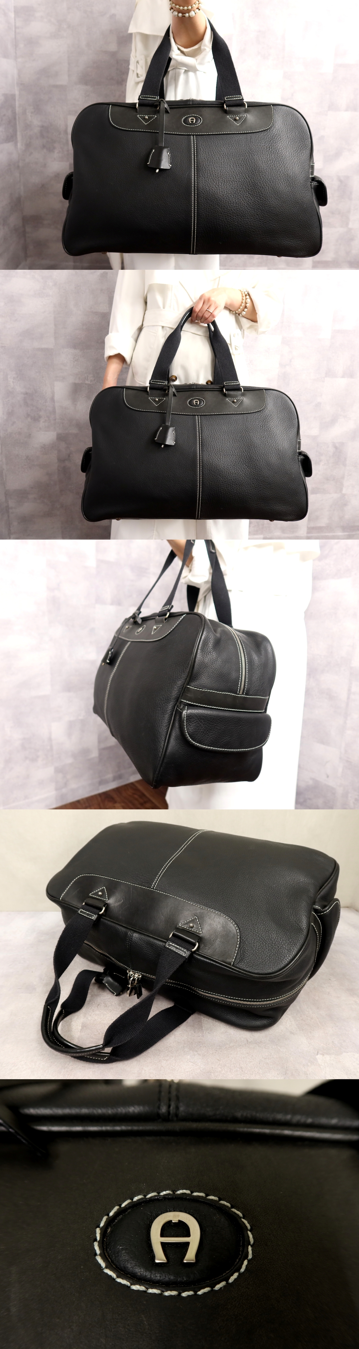 Store ●超美品●AIGNER アイグナー●ロゴ金具●ステッチ●カーフ レザー 本革●ボストン バッグ●黒●シルバー金具●腕掛け●かばん●Js67188