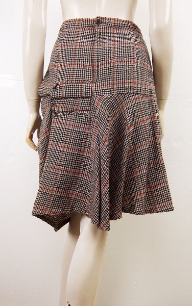 特徴:アシメトリーの個性的スカートです。ブリクレッド系(レンガ系)×グレンチェック柄ブラック系×ベージュ系の軽やかなふんわりウール。様々な形のパネル!切りっぱなしパネル&フレアーパネル&垂るみをもたせ袋状に見せたパネルをアシメトリーにデザインされ裏地もモダンな柄のお洒落上級スカートです。 ---↓ここにサイズ記入----