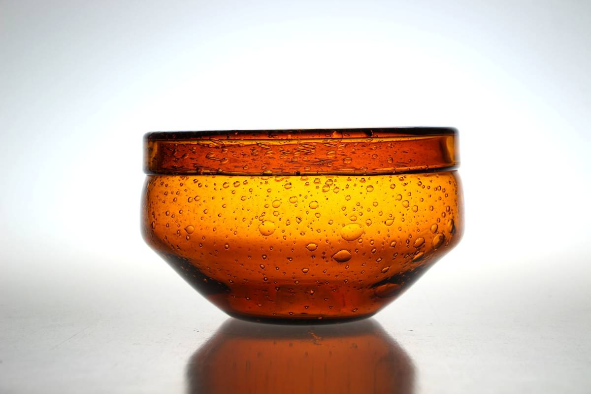 上部に折り返しの付けられたボウル。気泡も沢山入っており、光を受けるとアンバーがゴールドのように輝きとても綺麗です。*底部にカットサインが入っています。