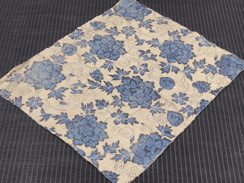 詳細  きなり色の地に、牡丹唐草の文様が染められている、綿の和更紗のはぎれです。