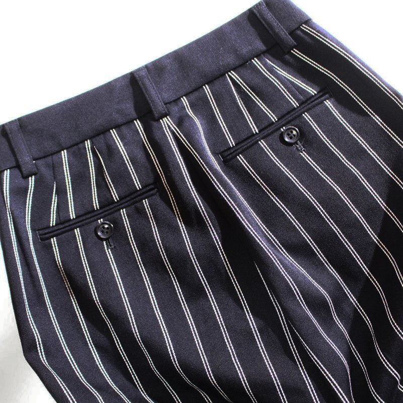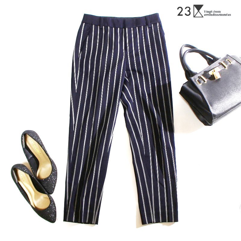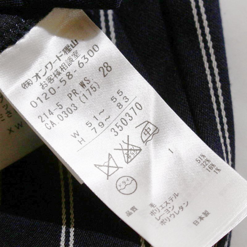 美品 23区 S 株) オンワード樫山 小さいサイズ28 毛51% ストライプ柄 ストレッチ ジャージ― パンツ ネイビー 紺 ホワイト 白 1号