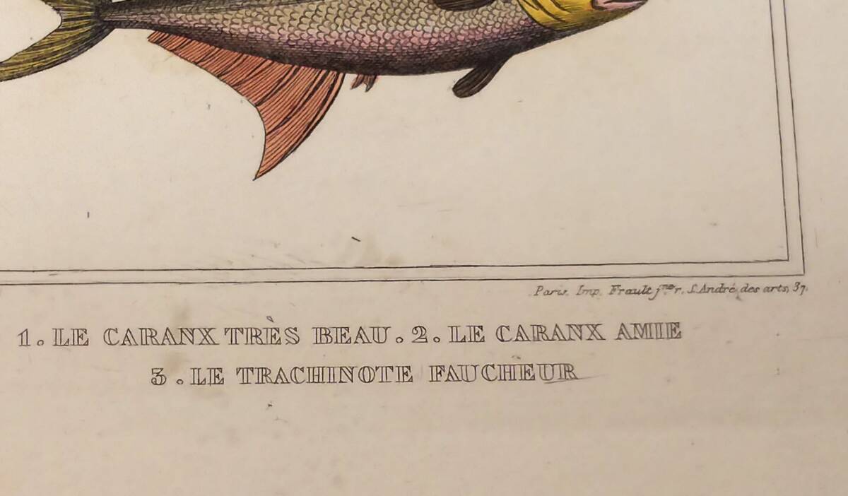 フランスアンティーク ラセペードの魚の手彩色博物図版 Pl.41 ギンガメアジ属 1845年/ビュフォン 博物画 博物図譜