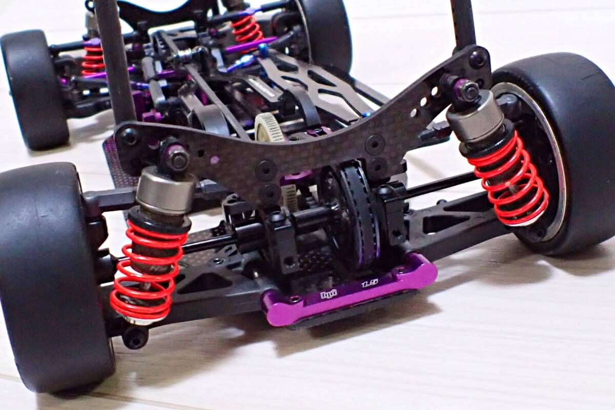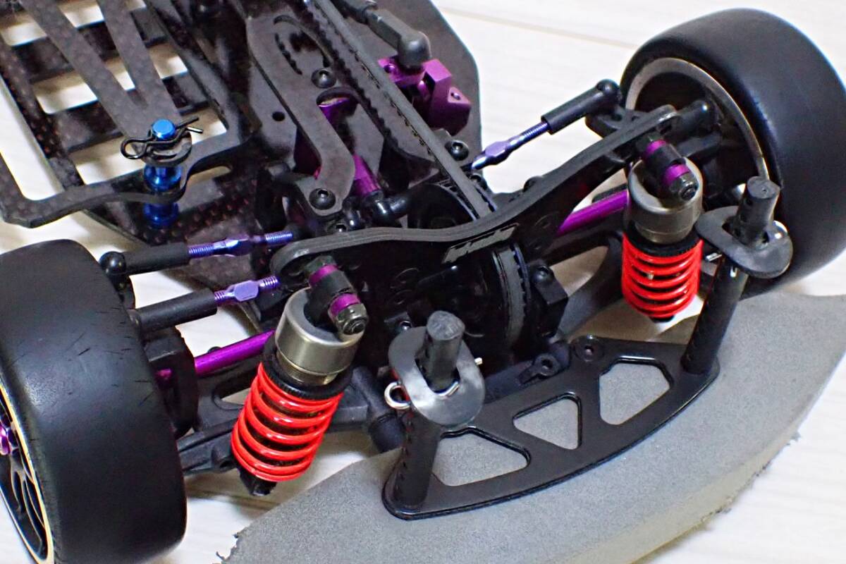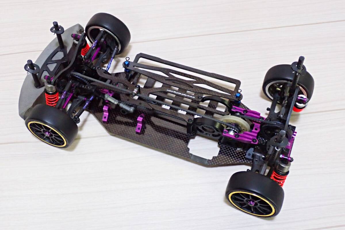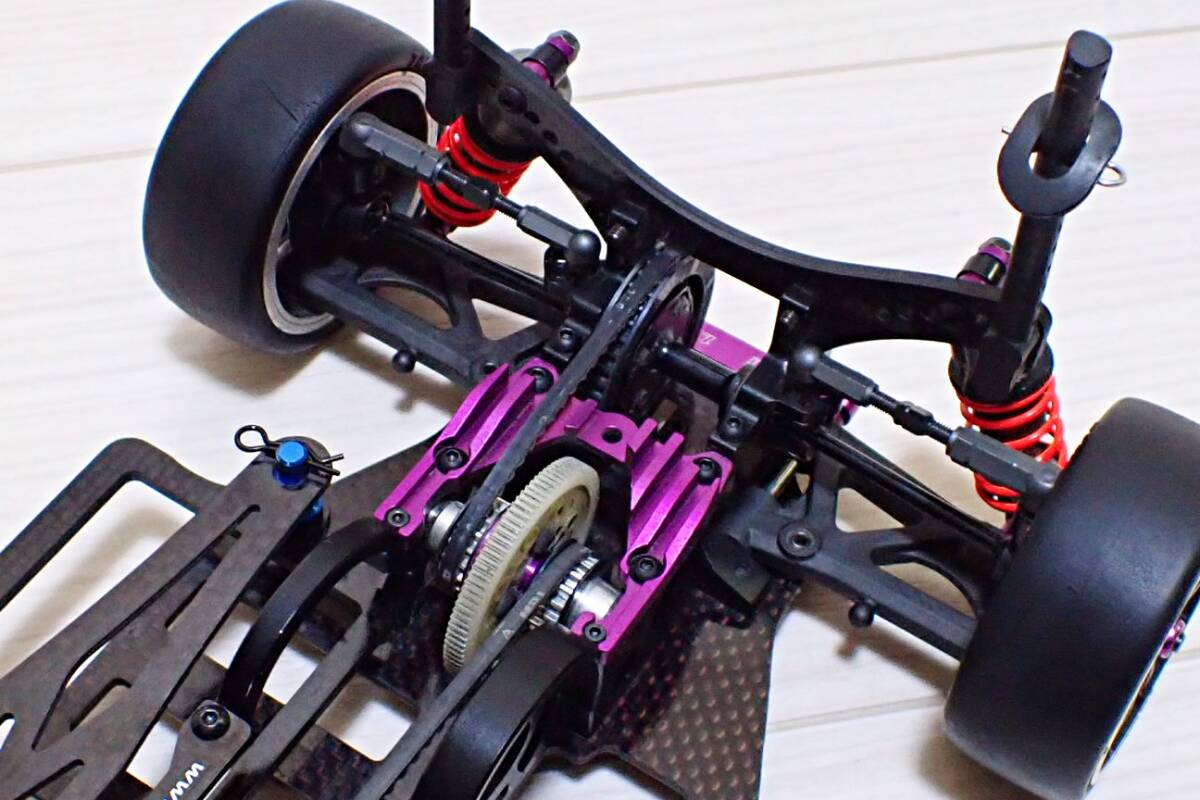 カーボンシャーシでタミヤTRFダンパー、前後ユニバーサルシャフト、クランプ式アルミハブ、アルミサーボステイ、アルミモーターマウント・ブリッジ(ブラック)、アルミステアなどいろいろ組まれてます。