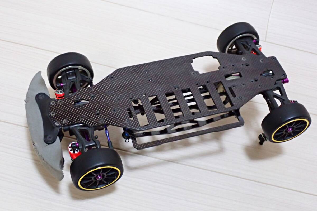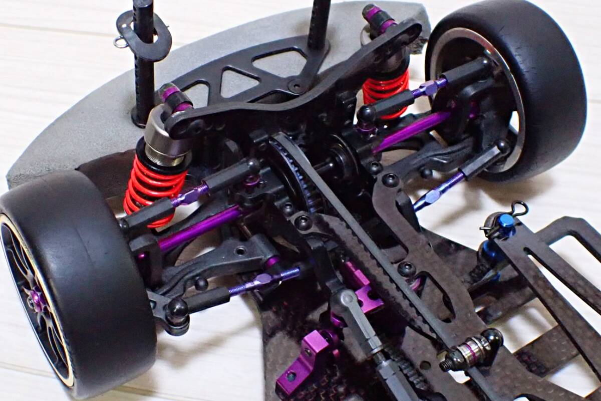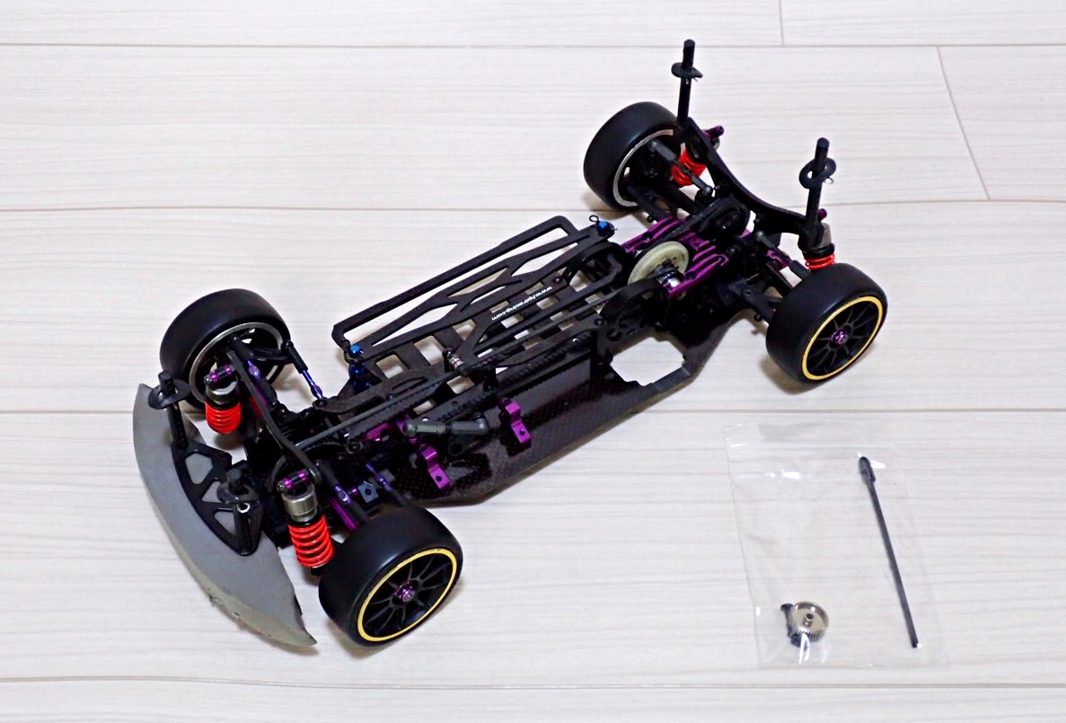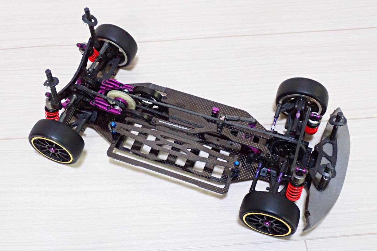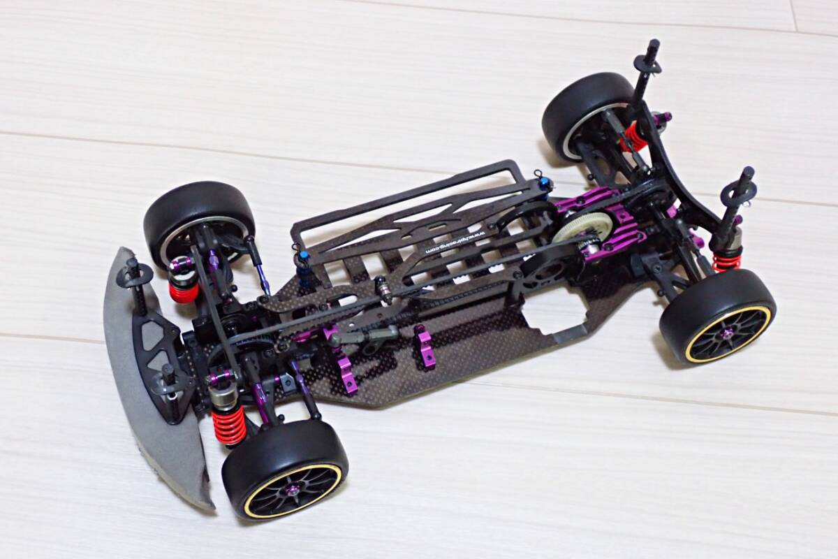 カーボンシャーシでタミヤTRFダンパー、前後ユニバーサルシャフト、クランプ式アルミハブ、アルミサーボステイ、アルミモーターマウント・ブリッジ(ブラック)、アルミステアなどいろいろ組まれてます。