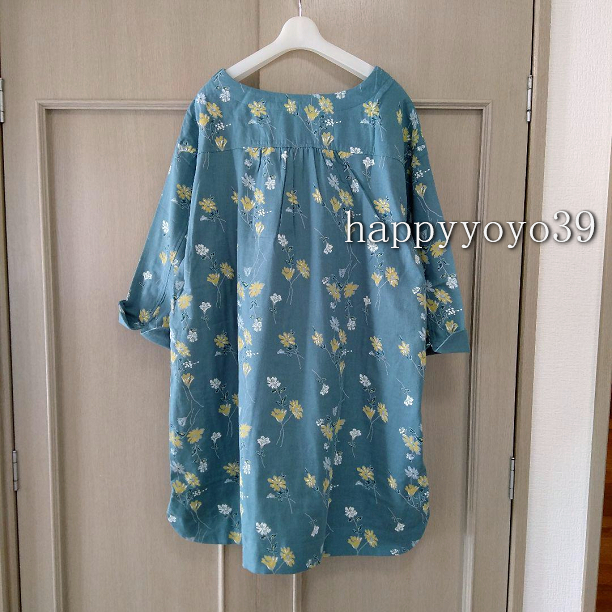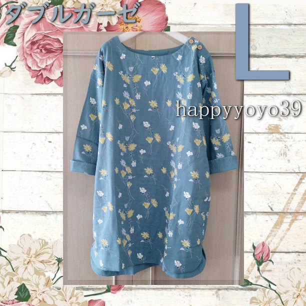 激安 新品 L スモークブルー ダブルガーゼ草花柄 七分袖 チュニック 大きいサイズ スキッパー割烹着 チュニックワンピース ブラウス ミセス