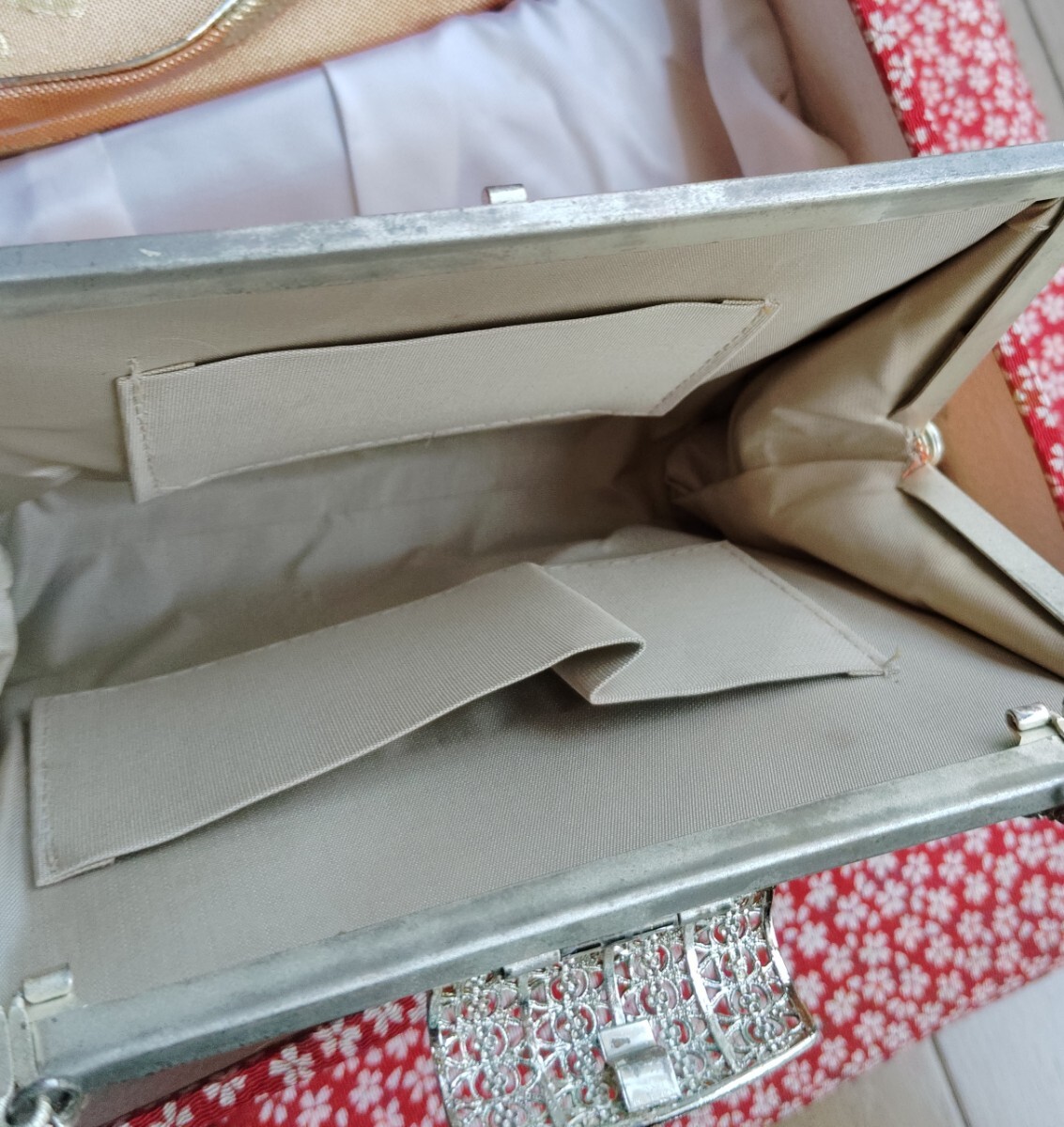 オレンジに金の花柄刺繍が施された西陣織の草履とバッグのセット。