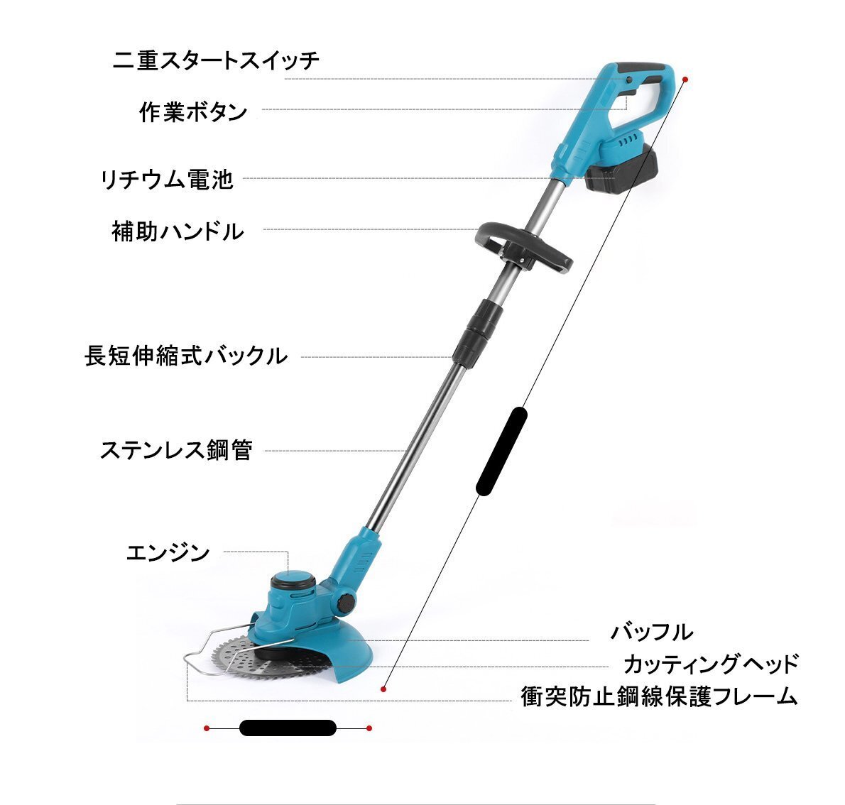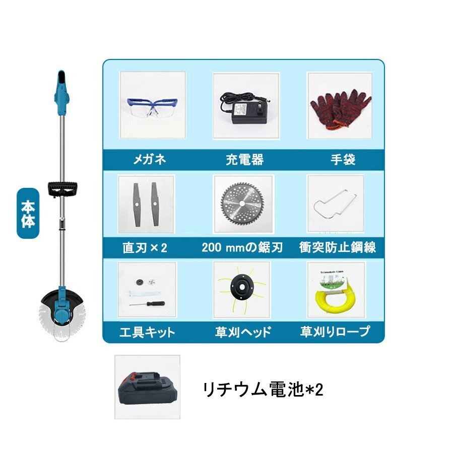 ◇付属品:本体+リチウム電池* 2 +充電器* 1 +手袋+メガネ+平刃* 2 + 200mmのこぎり刃* 1 +衝突防止ワイヤー* 1 +ツールバッグ+刈り取りヘッド* 1 +刈り取りロープ* 1