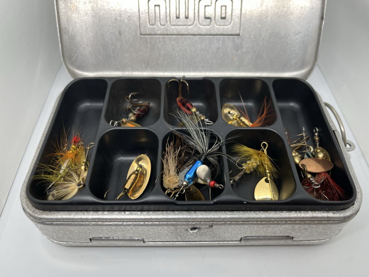 UMCO アムコ P-9 ビンテージ タックルボックス アルミ製 毛針 ルアー 付き