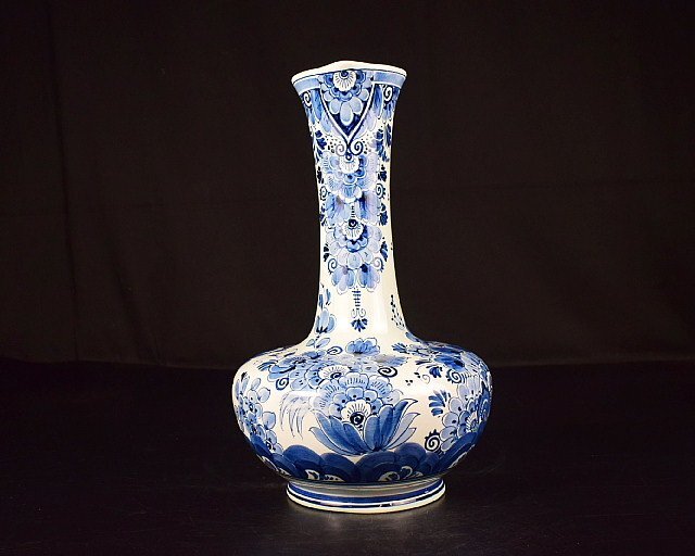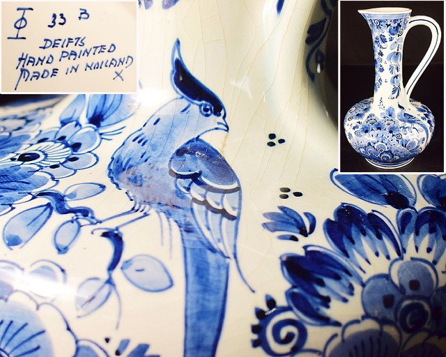 青と白を基調とした陶器で、デルフトブルーと呼ばれる特徴的な絵付けが施された素敵なお品で御座います。