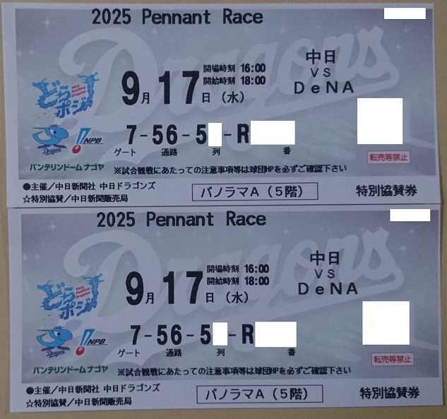 2025 Pennant Race 中日ドラゴンズ VS 横浜DeNAベイスターズ バンテリンドーム 2025年9月17日(水) 開始18:00 パノラマA席 チケット 未使用