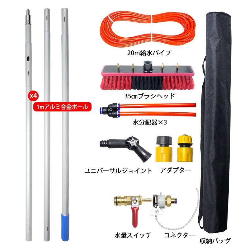 ◇付属品:1mアルミ合金ポール×4、20m給水パイプ、35cmブラシヘッド、水分配器×3、ユニバーサルジョイント×1、アダプター、水量スイッチ、コネクター、収納バッグ