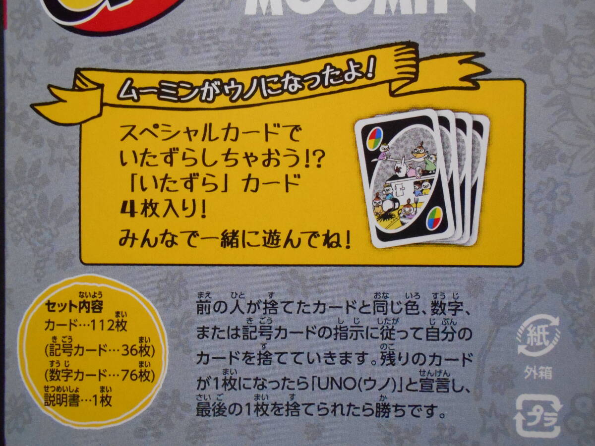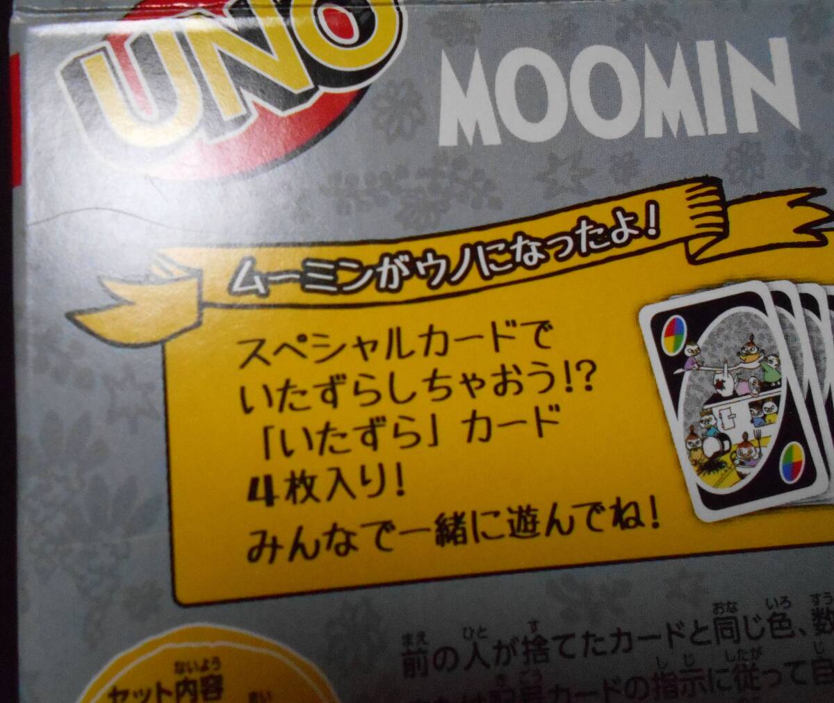 ウノ ムーミンオリジナルのスペシャルルールが適用される「いたずら」カードも4枚入って、一層楽しく、特別なウノに仕上がりました。