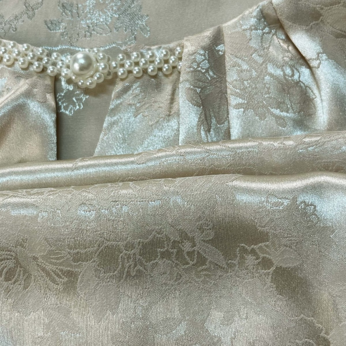 上品な光沢を放つシルク混素材を使用した、エレガントな印象の半袖ブラウスです。なめらかな肌触りで、軽やかな着心地が魅力。首元にはパールボタンをあしらい、さりげない華やかさをプラスしています。繊細で上品な花柄が全体に広がり、着こなしのアクセントに。夏らしさを引き立てる一枚です。