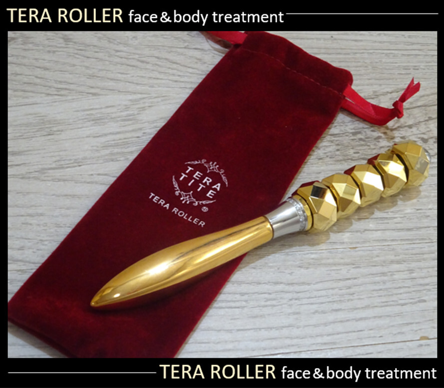 ローラー部分にテラタイト(テラヘルツ鉱石)を採用した『 テラローラー 』です。ダイヤモンドカットに加工された5つの独立したテラヘルツ鉱石の超振動波がお肌に最適なマッサージ効果をもたらします。フェイシャルからボディケアまで全身に使用できます。