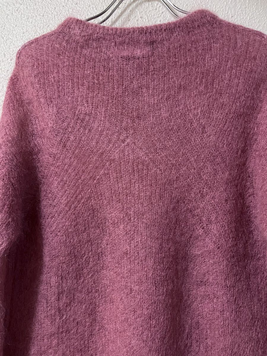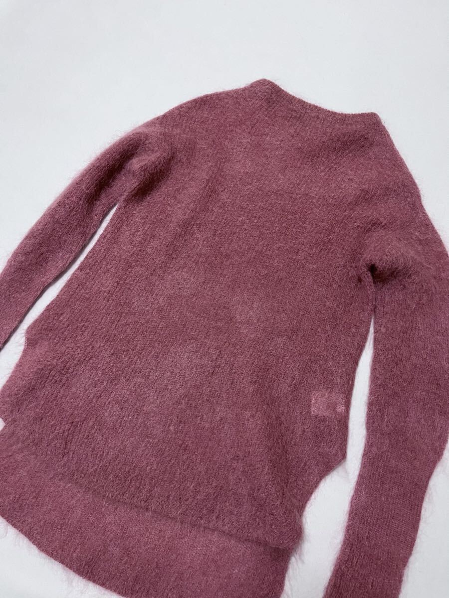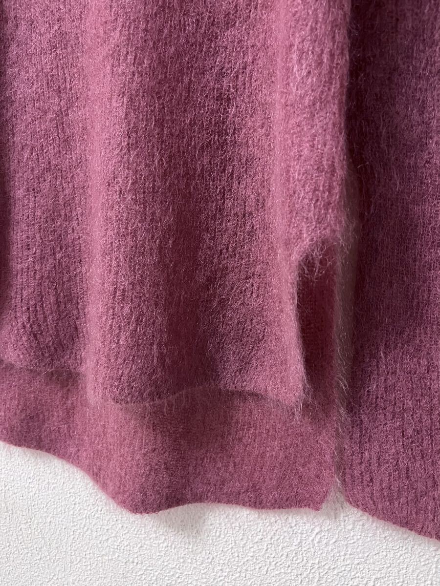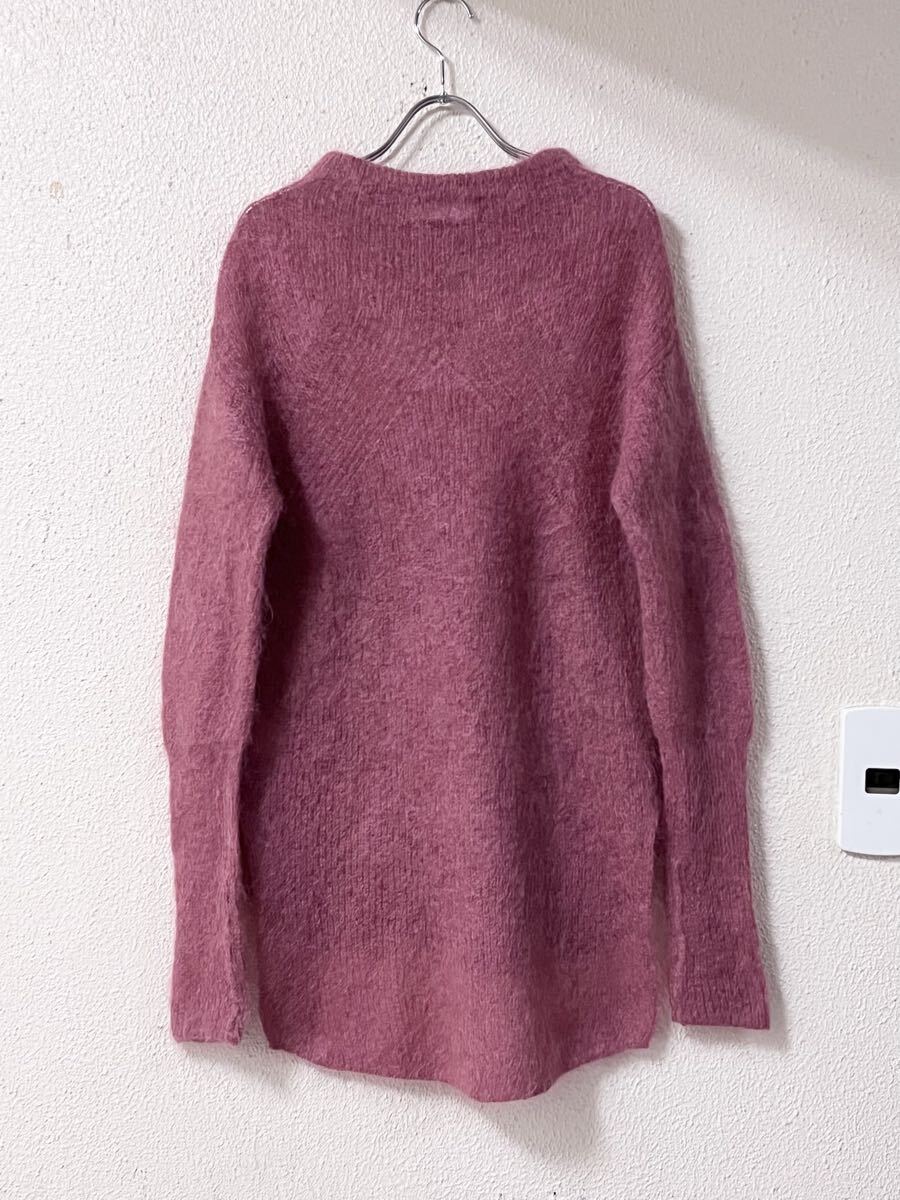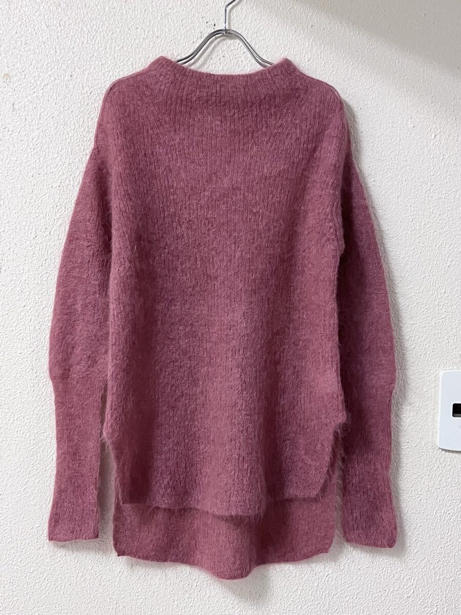 毛足の長い上質な薄手のモヘアニット、長くデザインされた後身頃、長めのリブなど、とてもデザイン性の高いニットです。