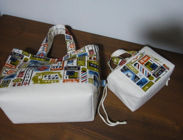 昭和レトロな看板ロゴの生地でランチバッグやちょっとしたお出かけなどに