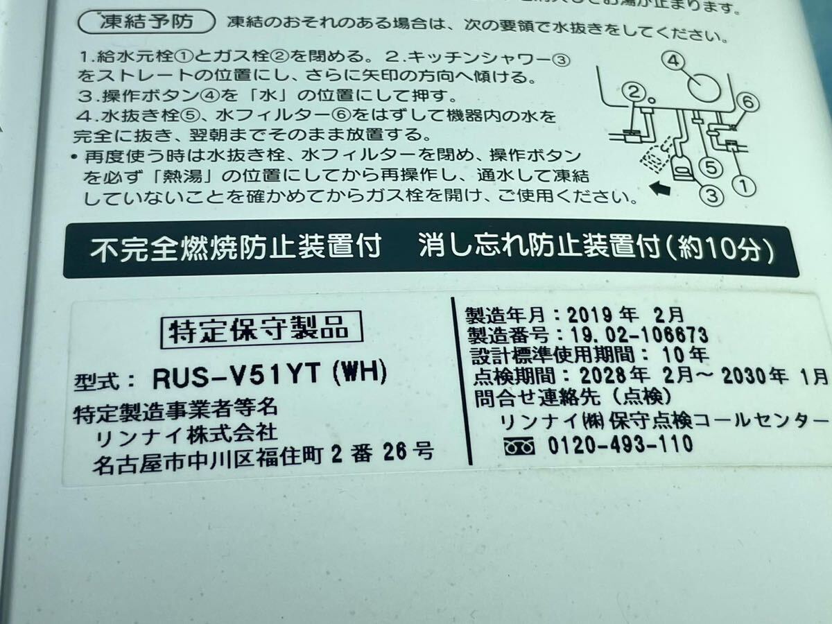 Product name: リンナイ RUS-V51YT(WH) LPガス用 瞬間湯沸かし器 2019年製