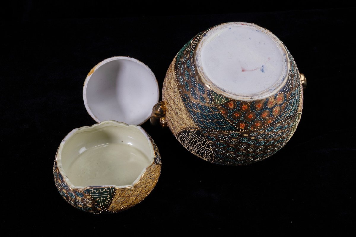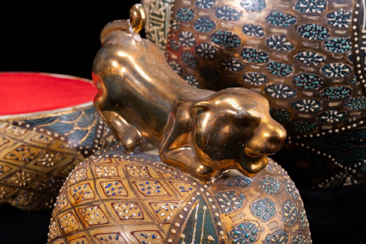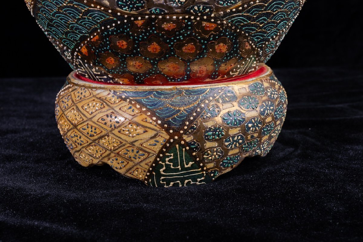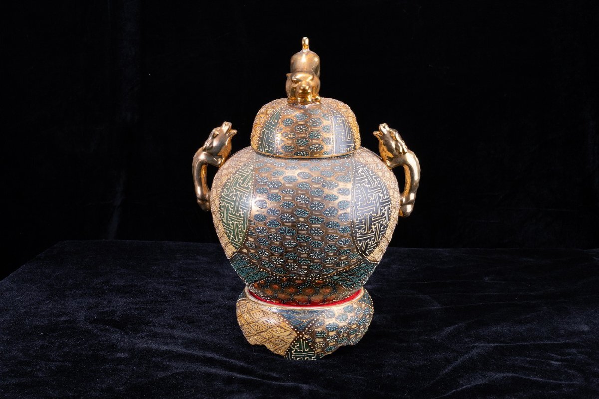 Product name: 【珍品堂】1円から M68-V01 薩摩焼 丸十字家紋 金彩 青粒盛彩色 盛描絵付 沈香壺 蓋付 高39cm 大壺 飾壺 時代物 骨董品 古美術
