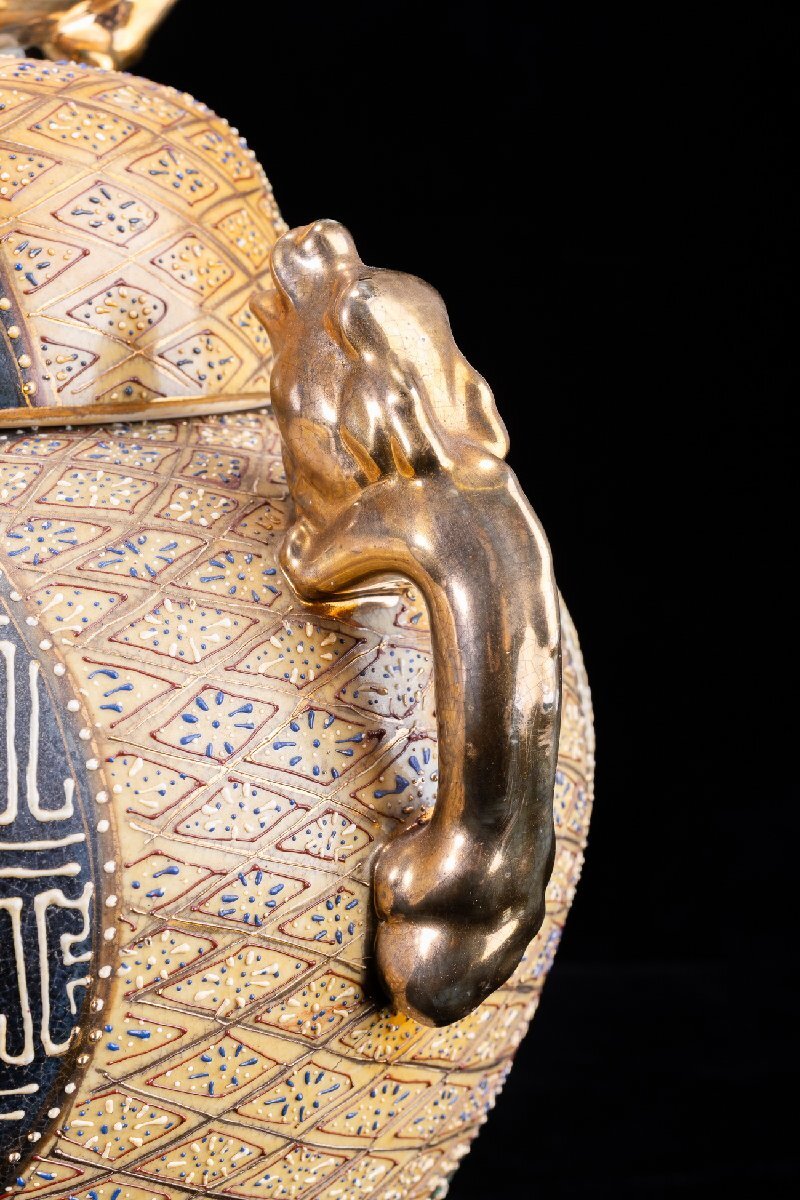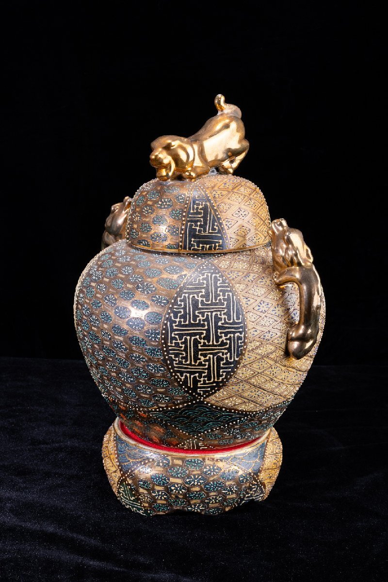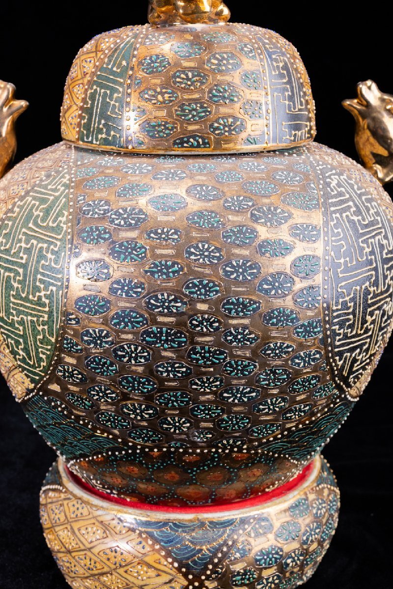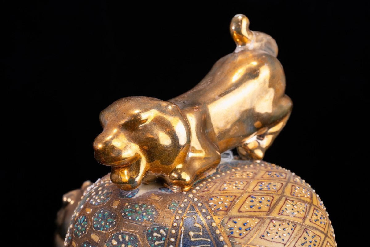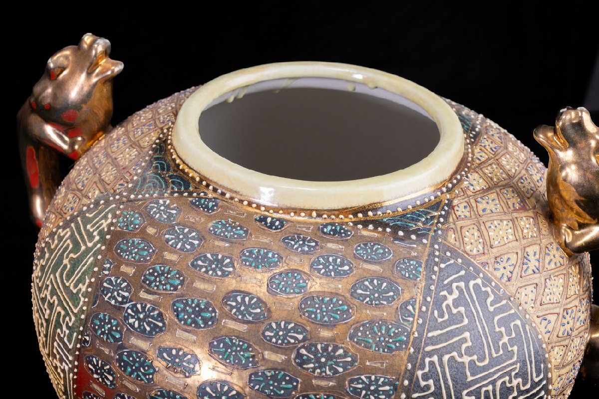 Product name: 【珍品堂】1円から M68-V01 薩摩焼 丸十字家紋 金彩 青粒盛彩色 盛描絵付 沈香壺 蓋付 高39cm 大壺 飾壺 時代物 骨董品 古美術